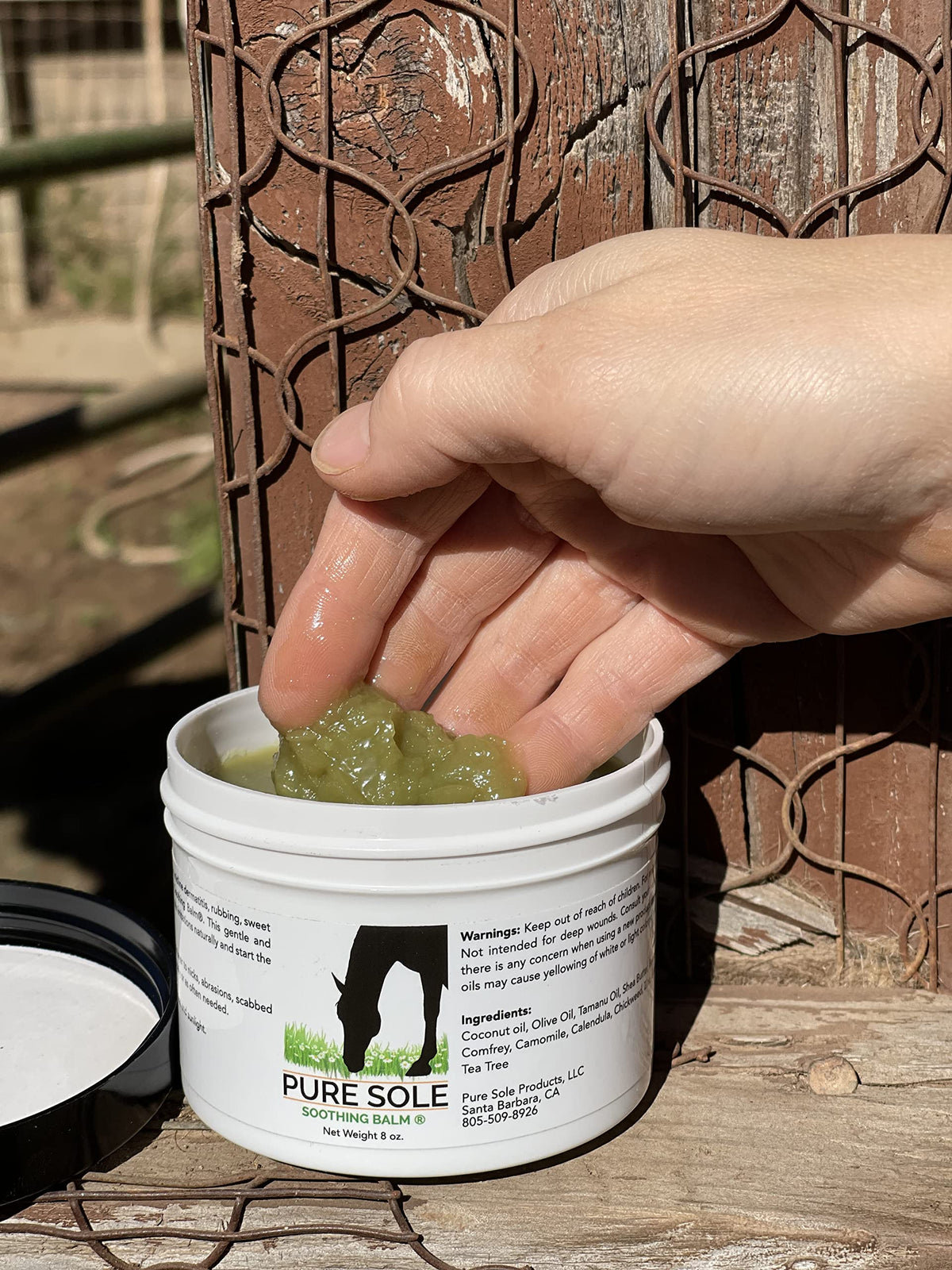 Pure Sole Soothing Balm tackles any skin issues of your horse with ease! It is a completely ALL NATURAL formula that contains shea butter that reduces skin inflammation, aloe vera that accelerates wound healing and soothing blends of essential oils! This formula is gentle yet highly effective to use on your horse. All Natural Ingredients - Free of any harmful chemicals.Pure Sole Soothing Balm is an all natural salve designed to soothe and heal skin irritation such as midline dermatitis, sweet itch, and rubbing.Its deeply calming ingredients soothe the area immediately allowing for the healing to begin! Keeping your horses skin healthy at the same time.Directions:Scoop out a small amount and apply a thin layer to nicks, abrasions, scabbed skin, or along the belly to soothe midline itch. Apply daily or as often needed. Note that some essential oils can cause yellowing of white or light colored hair.