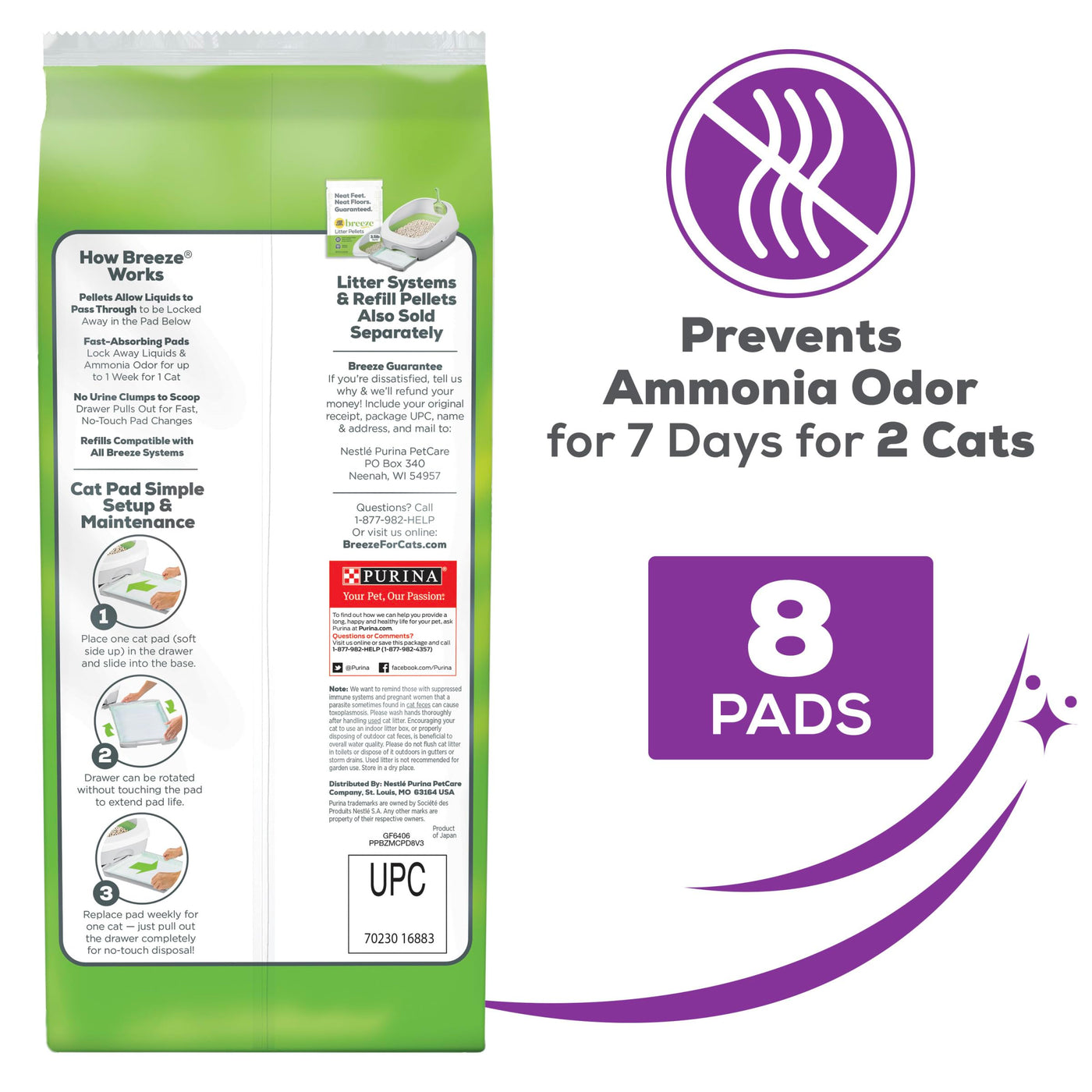 Q: How do Purina Tidy Cats Breeze Pads work?A: Purina Tidy Cats Breeze Pads are designed to absorb liquid efficiently, locking in moisture to prevent urine odor and keep the litter box dry. Each pad is crafted with super-absorbent material, making them ideal for multi-cat households.