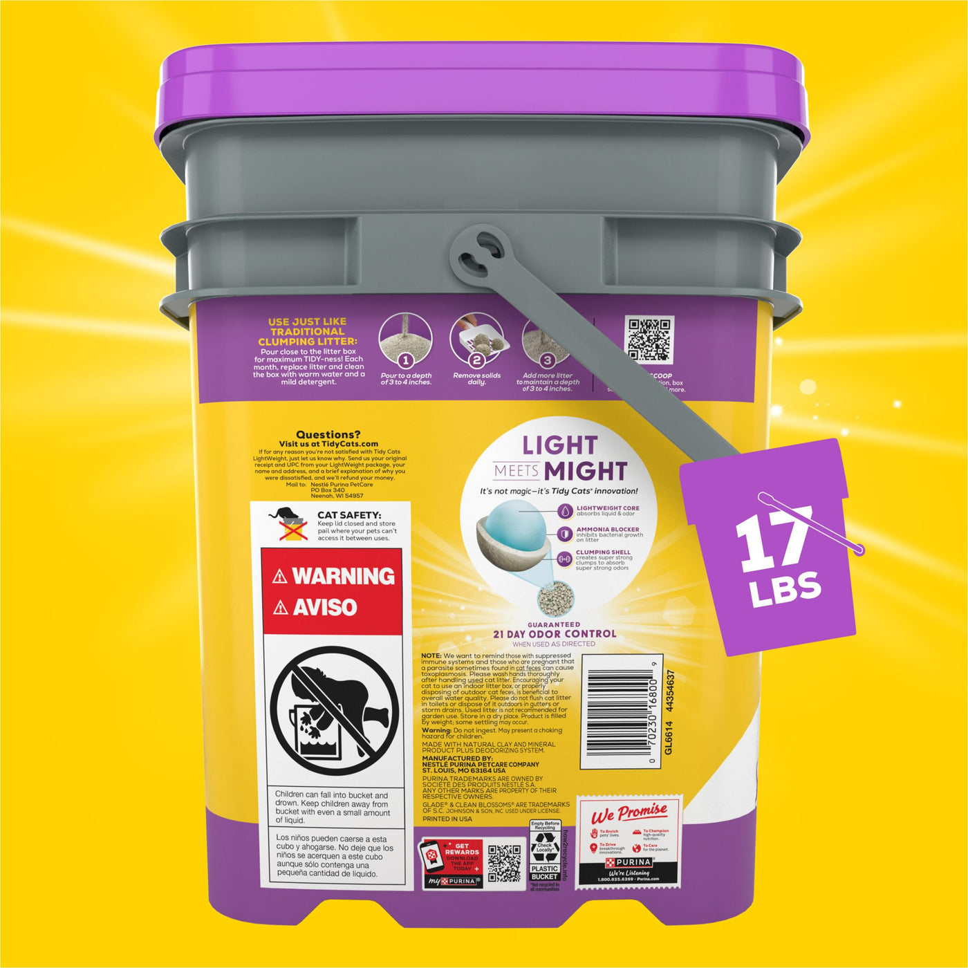 Q: What are the benefits of using Purina Tidy Cats Light Weight litter?A: Purina Tidy Cats Light Weight litter offers several benefits, including powerful odor neutralization with Glade Tough Odor Solutions, a low-dust formula that minimizes mess, and a lightweight design that makes it easy to handle. It features an ammonia blocker that prevents odors for up to 14 days when used as directed, making it ideal for multi-cat households.