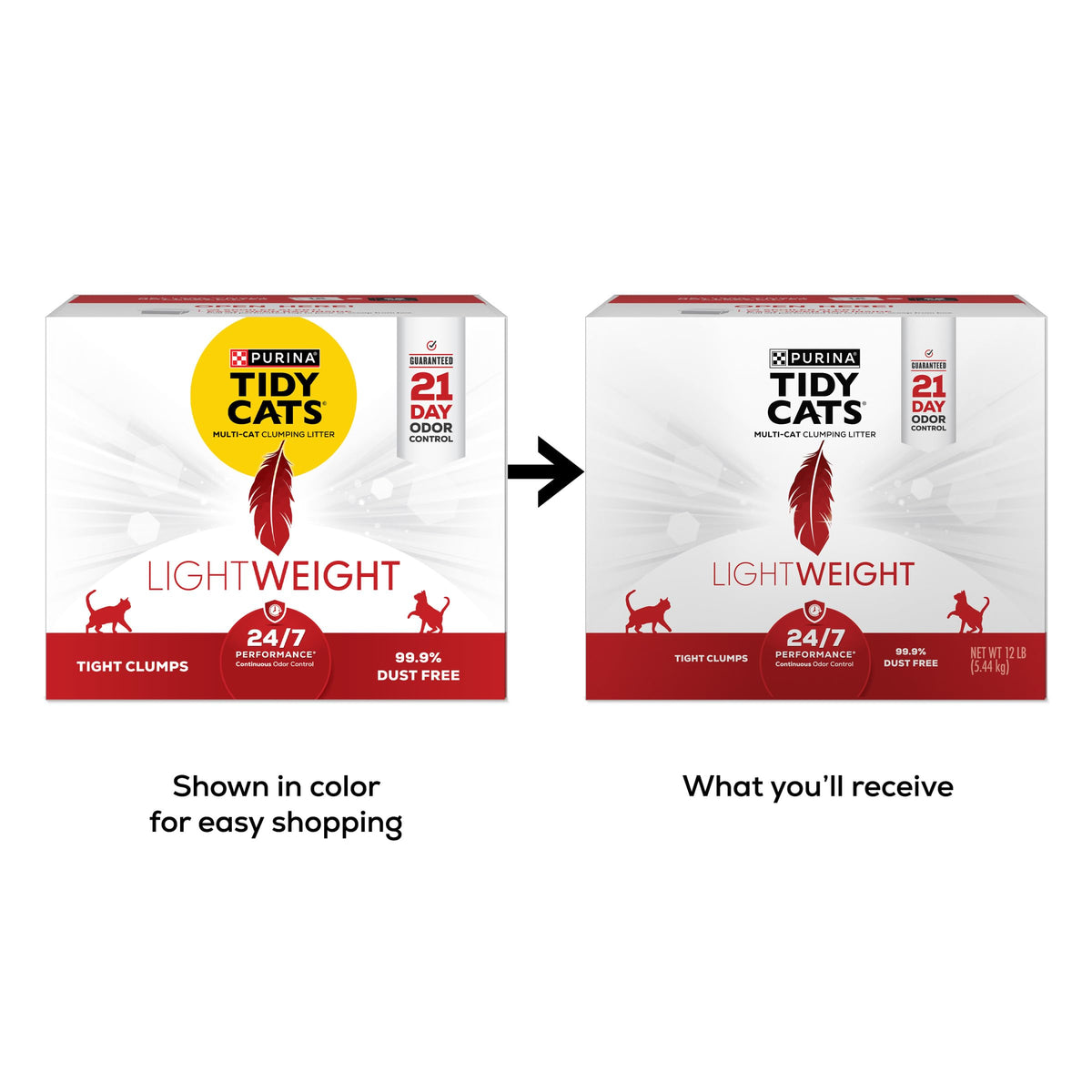 Lighten your load as you maintain your cats litter boxes with Purina Tidy Cats LightWeight 24/7 Performance clumping cat litter. This multi cat kitty litter contains triple-odor protection to defend your home against strong smells and leaves behind a fresh, clean linen scent. This lightweight clumping litter formula weighs half as much as leading clumping kitty litter, making it so easy to carry, you feel like saying, Toss me that litter. With an added Ammonia Blocker that keeps ammonia odor from forming for 14 days when used as directed, this odor control cat litter provides protection from lingering smells all day and all night. The strong, tight clumps allow for convenient scooping, so litter box cleaning is simple and speedy. Plus, the slow-release deodorizing system in Purina Tidy Cats LightWeight cat litter ensures continuous odor control with absorbency and clumping in every patented granule. Our low dust cat litter formula provides a clean and easy pour. Fill your cats boxes with around-the-clock odor control, and give them a Tidy place to call their own.
