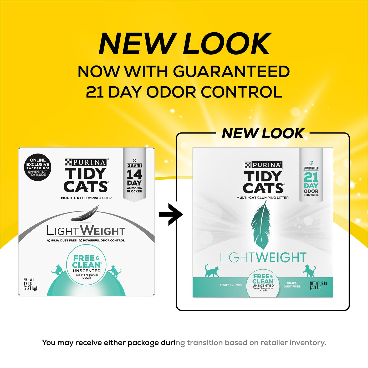Keep your cats' litter boxes tidy with Purina Tidy Cats LightWeight Free and Clean Unscented With Ammonia Blocker clumping multi cat litter. This unscented cat litter is free from fragrances and dyes, and the low-dust composition means it pours easily and cleanly into the litter box. Activated charcoal in the clay cat litter absorbs odors on contact, while an Ammonia Blocker prevents ammonia odor from forming for 14 days when used as directed. This cat litter helps keep your home smelling fresh. Weighing half as much as the leading clay clumping cat litter, this Tidy Cats lightweight cat litter is also easy to carry, pour and store to make taking care of the litter pan easy. The odor control cat litter formula helps lock in moisture, keeping your cats comfortable. Rest easy using this unscented lightweight cat litter for your whole cat family, knowing it's made by Tidy Cats, a brand most often recommended and personally used by veterinarians.