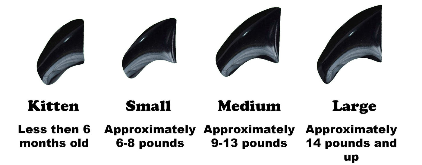 Q: What size nail caps do I need for my cat?A: Purrdy Paws offers four sizes: Kitten (less than 6 months), Small (6-8 pounds), Medium (9-13 pounds), and Large (14 pounds and up). Most adult average size cats fit into the medium size.