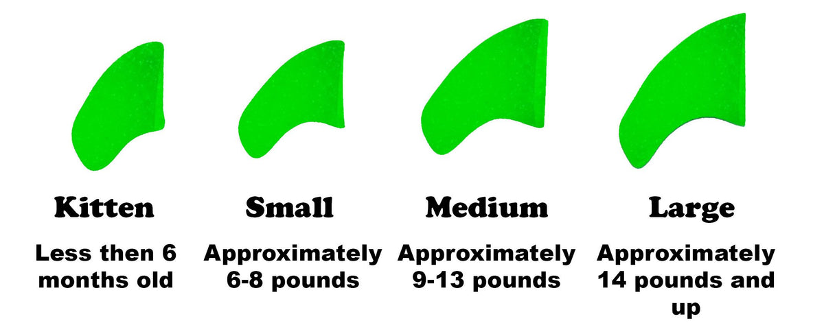 Q: What size of Purrdy Paws nail caps should I choose for my cat?A: Purrdy Paws nail caps come in various sizes: Kitten (for cats less than 6 months old), Small (approximately 6-8 pounds), Medium (approximately 9-13 pounds), and Large (14 pounds and up). Choose the size based on your cat's weight and age for the best fit.