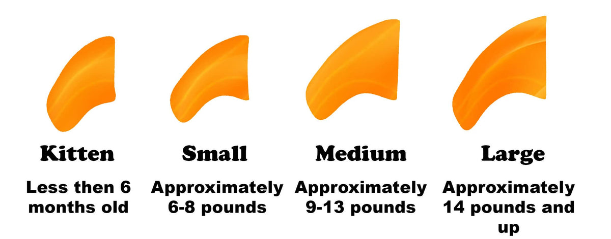 Q: How do I know which size of Purrdy Paws nail caps to choose for my cat?A: To select the right size of Purrdy Paws nail caps, consider your cat's weight and age. Kittens under 6 months typically fit into the kitten size, while small cats weighing 6-8 pounds should use small caps. Most average adult cats, weighing between 9-13 pounds, will require medium caps, and larger cats over 14 pounds will need the large size.