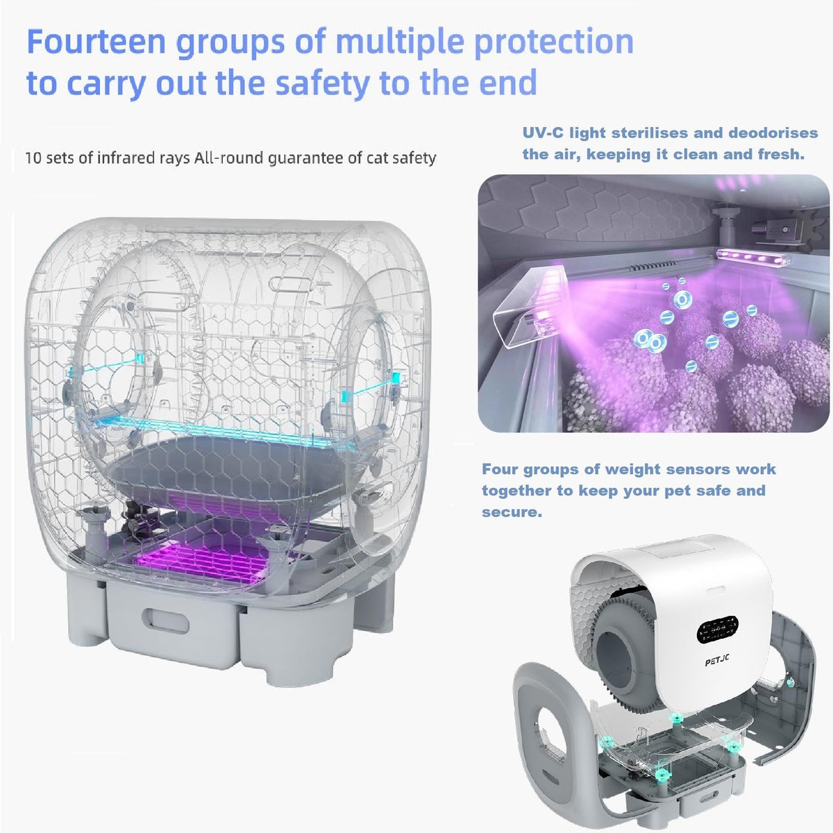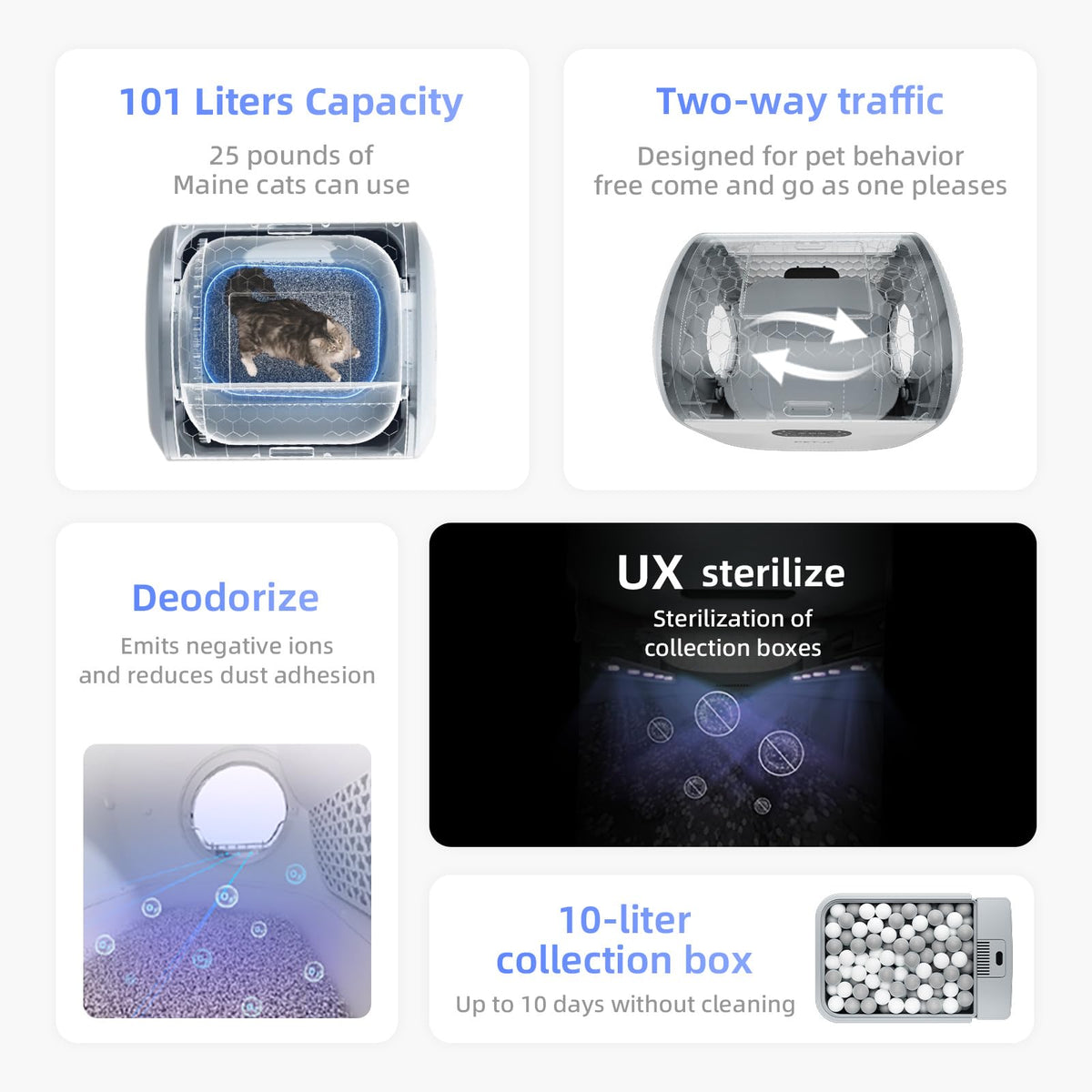 Pvevtv Unimpeded Self Cleaning Litter Box, 110L Automatic Cat Litter Box Self Cleaning Suitable For Multiple Cats Free Odors Smell Low Noise No More Scooping For 10 Days Effortless Cleanliness: Embrace The Future Of Pet Care With The Unimpeded Smart Litter Box. Engineered For Large Cats, This Extra-Large Automatic Litter Box Self-Cleaning Unit Ensures A Hygienic Environment For Up To 10 Days, Featuring A High-Quality No-Leakage Waste System. Safe Design: Our Infrared Sensors Guarantee Your Pet'S Safety. The Smart Litter Box Pauses Operation When Your Cat Is Present, Providing A Secure And Peaceful Experience. Eco-Friendly &Amp; Cost-Effective: Opt For Sustainability With Our Self-Cleaning Cat Litter Box. It Minimizes Litter Usage, Saving You Money While Reducing Your Environmental Footprint. Odour Elimination: Say Goodbye To Unpleasant Smells With The Unimpeded Robot Litter Box. Its Advanced Odor Elimination System Neutralizes Odors For A Fresh Home, Compatible With All Types Of Litter. Quiet Operation: Experience Serenity With Our Ultra-Quiet Technology. The Unimpeded Litter Box Operates At Just 55 Decibels In 10 Cm, Preserving Your Home'S Tranquility. Simple Set-Up And Upkeep: Simplify Your Life With Our Easy To Use Litter Box. Quick Assembly And Hassle-Free Maintenance Ensure A Consistently Clean Space For Your Cat. Perfect Cat Owner Starter Kit: Get Everything You Need In Our Perfect Cat Owner Starter Kit. Including Litter Bags And A Mounting Tool, With A Lifetime Warranty For Peace Of Mind. No App Needed: Enjoy Streamlined Pet Care With Our Self-Cleaning Cat Litter Box. Designed Without The Need For An App, It Offers Essential Functions For Modern Convenience