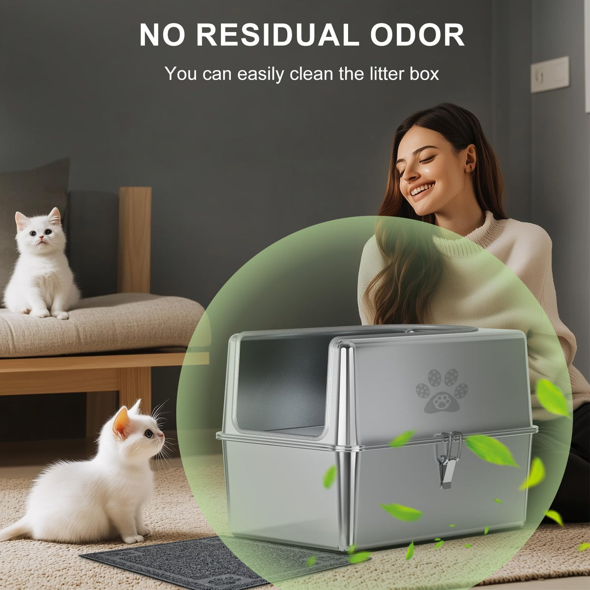 If You Dont Like Plastic Litter Boxes That Collect Residue And Odors, Then You Can Choose This Upgraded All-Metal Enclosed Stainless Steel Litter Box! Accessories List: Product Body: Stainless Steel High-Sided Lid, Stainless Steel Pedal, Stainless Steel Buckle, Stainless Steel Cat Litter Box. Included Tools: Cat Litter Scoop, Cat Litter Mat, Non-Slip Mat. Cat Litter Box Size: Large: 23.6X15.7X11.8In X-Large: 23.6X15.7X15.7In Cat Litter Box Features: 1. Closure Type: Semi-Enclosed, Top Opening And Side Opening. 2. Durable: Scratch-Proof, Rust-Proof, Not Easy To Damage, And Can Be Used For A Long Time. 3. No Residual Odor: The Non-Porous Nature Of Stainless Steel Does Not Absorb Odors, So Odors Will Not Remain On It After Cleaning. 4. Non-Stick & Non-Slip: The Smooth Surface Allows Pet Poop To Fall Off Easily, And Feces And Cat Litter Clumps Can Be Easily Collected And Handled, Easy To Clean. There Are Four Anti-Skid Pads At The Bottom Of The Litter Box, Which Can Improve The Stability Of The Cat When Using The Toilet And Prevent Unnecessary Sliding. 5. Easy To Install & Stable Structure: After Installing The Pedal, You Only Need To Use The Metal Buckle To Link And Fix The Cover And The Litter Box To Easily Complete The Assembly And Use Of The Litter Box. The Design Of The Metal Buckle Allows You To Easily Stabilize The Structure Of The Litter Box And Is Not Easily Pushed Away By The Cat.