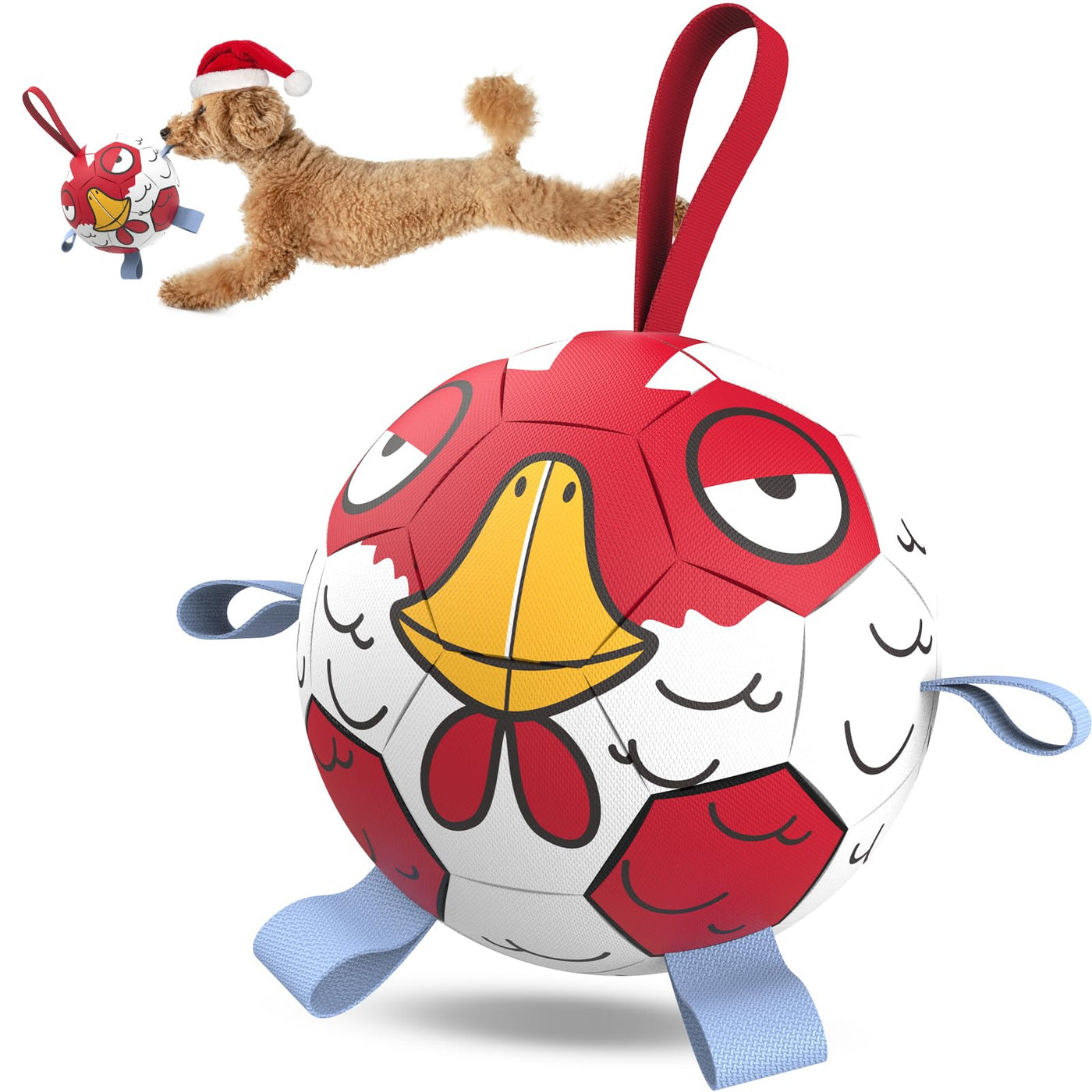 HERENEW cHIcKEN DOg BALL TOYUnlike regular soccer balls our new design chicken dog ball toy is more colorful your dog will love this soccer ball at first sight let your dog interact with our soccer ball in a natural way as if playing with a new friend inspire your dogs enthusiasmchoose the right size for your dog for a better experience: 20-40IBS choose medium dog ball toys 40-90IBS choose large soccer ball toys Why choose chicken Dog Ball ToycHIcKEN DOg SOccER BALL TOY can help your dog release energy enhance intelligence and relieve loneliness and anxiety Dog ball toys are a necessary and reliable choice if you want your dog to be healthy and happyDo not hesitate our chicken dog ball toy will be the best giftIf your dog doesnt like it you can always get a refund Upgrade Interactive Dog Toyog soccer ball with nylon tabs sewn evenly into the seams not only create an erratic bounce that your dogs love to chase but also make it easier for your dogs to fetch toss tug and retrieveDog paws are printed evenly on the dog toys ball to attract your dog attentionTheres a longer strap for you to hold the ball making it a great interactive dog toy to train your dogs og Soccer Ball Improve Human Well-BeingWatching your dog chasing running playing and other activities can not only bring people happiness but also reduce stress and tension and enhance human well-beingOutdoor Dog Toys Improve your dogs physical fitness thereby improving their physical fitness and endurance QDAN Dog Soccer Ball Best gift For Your DogSend your dog birthday gift House and Outdoor Dog Toys can be played in the living room pool lake and beach because it is also Water Toys Ball no water absorption no seepage no deformation lightweight easy to float in waterDog Soccer Ball with grab straps are great for your dog catching balls and increasing your dogs interest in playing Durable Reusable Dog Ballogs will bite toys in their mouths so the dog scooter toys are made of harmless and non-toxic materials which will not cause any harm to your dogs Our dog ball is made of premium PU complying with the exact same safety standard as childrens toys we can let the dogs play with the child ATTENTION: This is limited to interactive dog not chew toys company After Sales Emailsupport@qdanpetscom Professional team to solve any dog ball problem for you