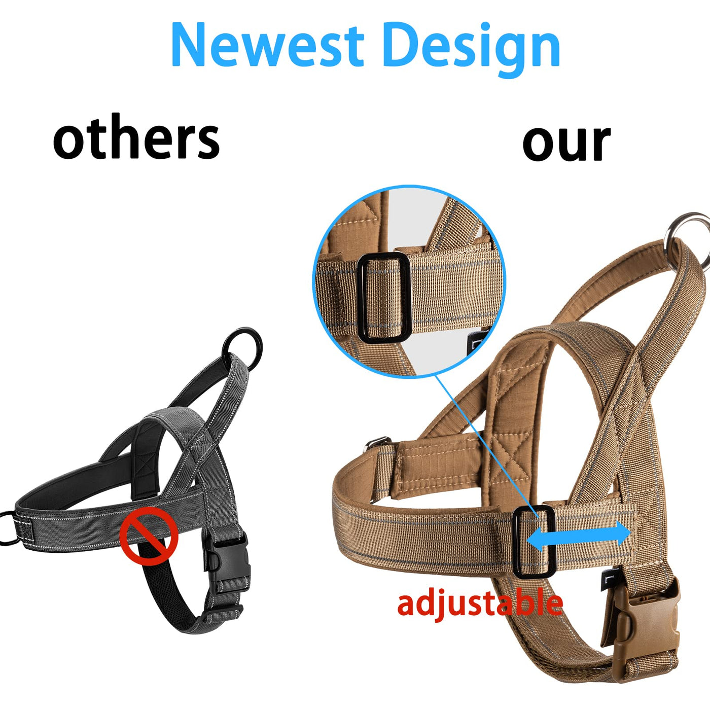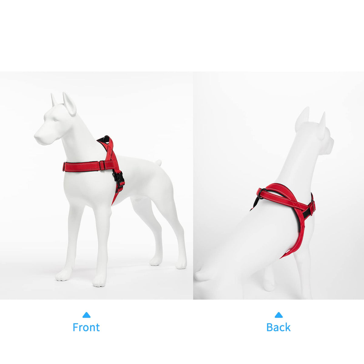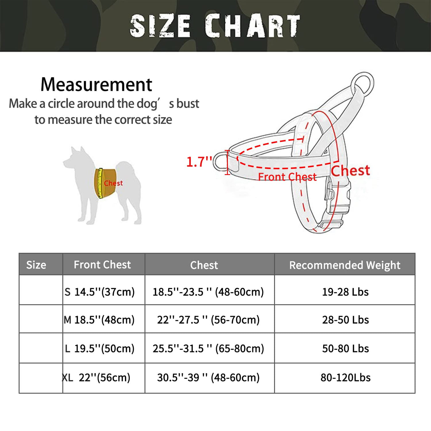 QIFBYFB Upgraded Fully Adjustable NO Pull Dog Harness Premium Material: We used durable nylon oxford padded with a soft cushion to protect your dog's skin. Tension-free design: While having the function of a collar, it can distribute the pressure to the chest to prevent the risk of suffocation. Comfortable and Useful Handle: The handle on the back is large and comfortable, and at the same time it can help you quickly control your dog and prevent unexpected situations from happening. Suitable for going out - There is 1 metal buckle on the back and front chest, which is convenient to connect various dog leashes, and very suitable for daily activities such as walking, climbing, cycling, etc. Size description: S-Front size - 14'' /Chest size- 18-22'' / Weight - 19-28 lbs / Wide - 1.8'' M-Front size - 18'' /Chest size- 22-27.5'' / Weight -28-48 lbs/ Wide - 1.8'' L-Front size - 20'' /Chest size- 25-31'' / Weight -48-79lbs / Wide - 1.8'' XL-Front size - 22'' /Chest size- 30-39'' / Weight - 79-121 lbs/ Wide - 1.8''