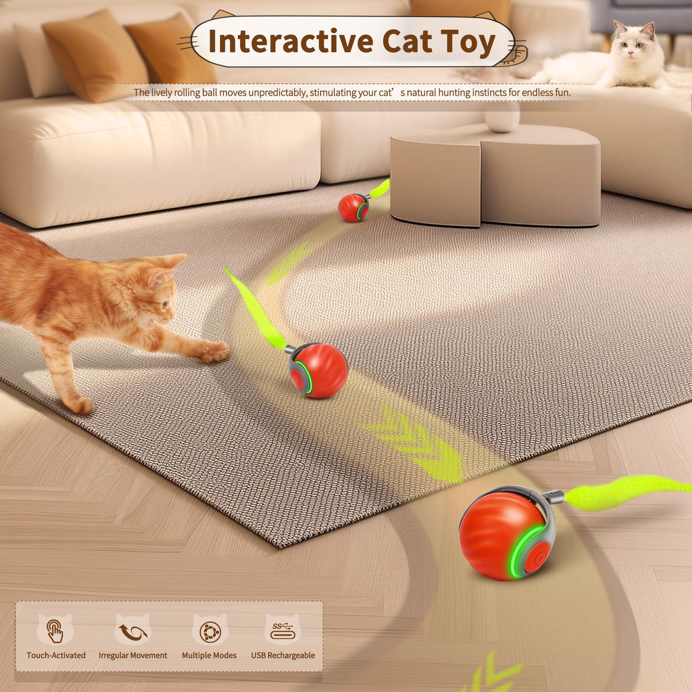 Qkoqko Speedy Tail 2.0 Interactive Cat Toy - Smart Self-Rolling Cat Ball With Feather Tail, Automatic Moving Motorized Toy For I