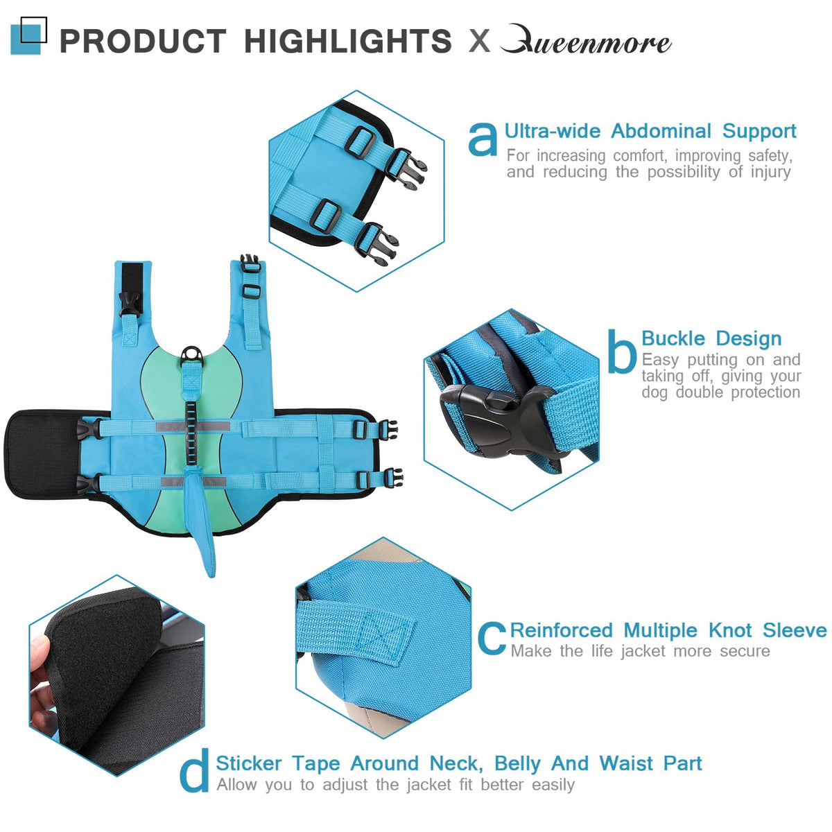 Queenmore Shark Dog Life Jacket, Dog Life Vests For Boating, High Buoyant Pet Life Vest For Swimming, Adjustable Easy On Cat Lif