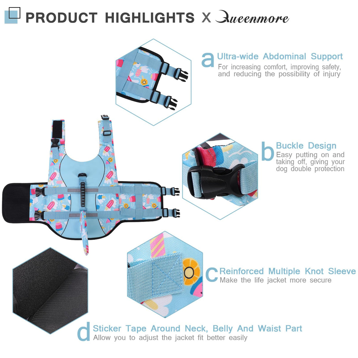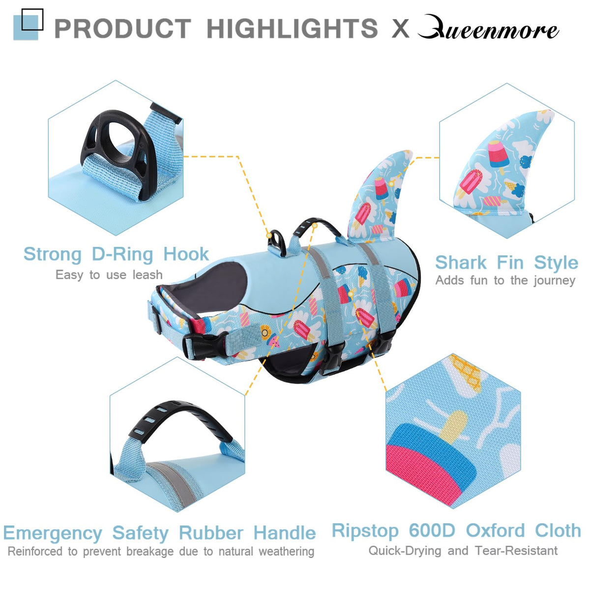 Queenmore Shark Dog Life Vest For Swimming, Dog Life Vests For Boating, High Buoyant Dog Life Jacket, Ripstop High Flotation Swi