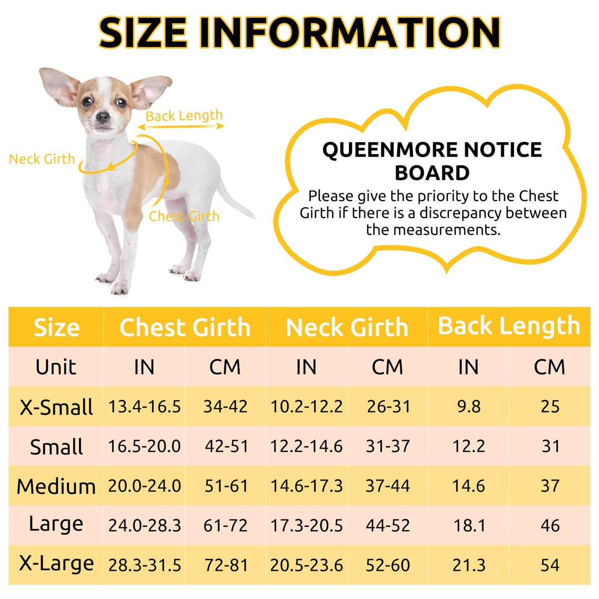 Q: What sizes are available for the Queenmore Warm Dog Coat?A: The Queenmore Warm Dog Coat is available in five sizes: X-Small, Small, Medium, Large, and X-Large. It is important to measure your dog's chest girth and back length using the provided size chart to ensure a proper fit.