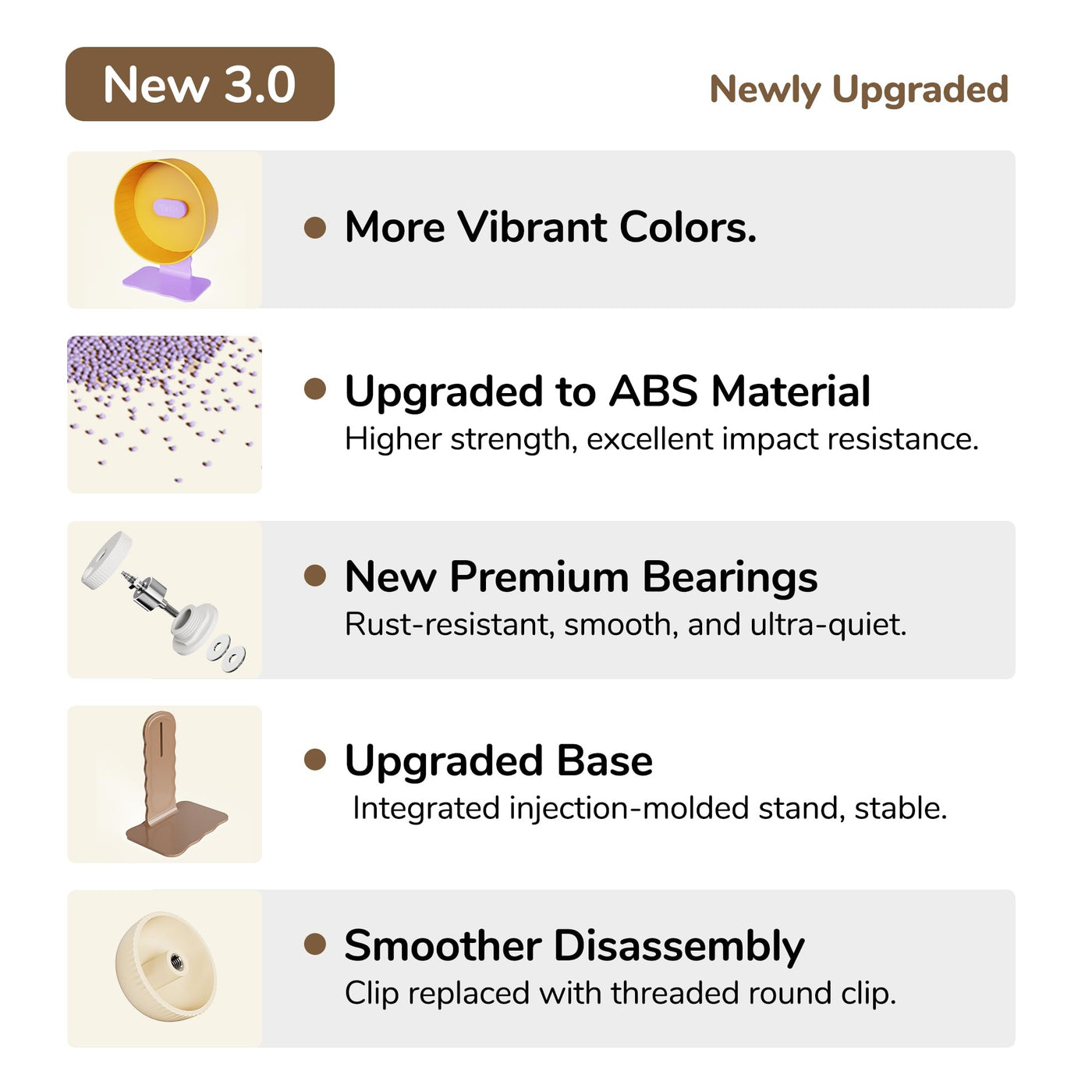 Our exercise wheel, available in two sizes, features high-precision bearings for smooth, quiet, and durable performance. The 8.7-inch wheel, with an adjustable height of 9.5-12.3 inches and a 3.3-inch wide runway, is perfect for Roborovski hamsters, Campbell hamsters, Chinese hamsters, Dwarf Winter White Russian hamsters, Lemmings, mice, and tiny Gerbils. The 10.2-inch wheel, with an adjustable height of 11-14.2 inches and a 3.5-inch wide runway, is suitable for Roborovski hamsters, Campbell hamsters, Chinese hamsters, Djungarian hamsters, Dwarf Winter White Russian hamsters, Lemmings, mice, young Syrian Hamsters (Teddy Bear Hamsters, Golden Bear Hamsters), and Gerbils. Non-slip ridges ensure safety, and the textured surface provides comfort. The adjustable height and wide base offer stability. Made of high-quality ABS material, the wheel is chew-resistant and available in multiple colors. The upgraded one-piece base design adds thickness and durability.