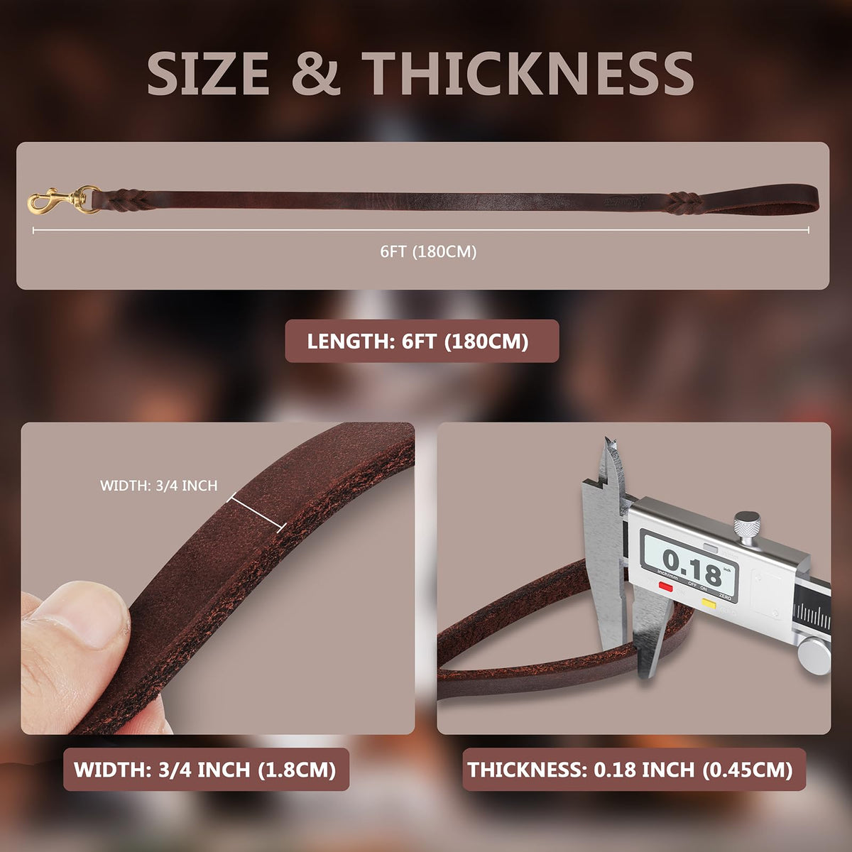 QUMY Genuine Leather Dog Leash-where luxury meets performance for the ultimate walking and training experience. Crafted from high-quality, full-grain leather, this leash is built to impress, designed for dog owners and trainers who demand both style and substance. At 6 feet long, it strikes the perfect balance between freedom and control, making it your ideal companion for every adventure, from daily walks to rigorous training sessions. Feel the difference in your hand with this leather dog leash, boasting a soft yet sturdy grip that remains comfortable through long walks and outdoor activities. Whether youre leading a high-energy large dog on a brisk morning hike or training a service dog in obedience classes, the QUMY leash ensures effortless control. Its heavy-duty design is reinforced with precision stitching, offering unparalleled durability, so you can trust it to withstand even the strongest pullers. The 360-degree solid brass hook guarantees a secure, tangle-free connection, while adding a touch of timeless elegance. No more wrestling with frustrating leash twists-the swiveling hook keeps your walks smooth and seamless. Whether your pup is a seasoned pro or a bundle of youthful energy, this strong dog leash will stand the test of time, perfect for breeds large and small. Designed for versatility, the QUMY leather dog leash is your go-to for everything from casual walks in the park to focused training sessions. Its 6-foot length gives your dog enough room to explore while keeping them close enough for firm control when necessary. Plus, the leashs anti-pulling feature makes it a reliable choice for training stubborn dogs to walk calmly by your side. Built for the rigors of everyday use, this durable dog leash isnt just strong-its stylish, with a sleek leather finish that ages beautifully over time. For those who value quality, performance, and luxury, the QUMY dog leash leather is unmatched.