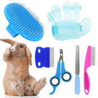 Q: What tools are included in the Rabbit Grooming Kit?A: The Rabbit Grooming Kit includes a nail clipper, a nail trimmer, a long handle comb, a short handle comb, a pet hair removal comb, and a pet shampoo bath brush, making it a comprehensive grooming solution for your small pets.