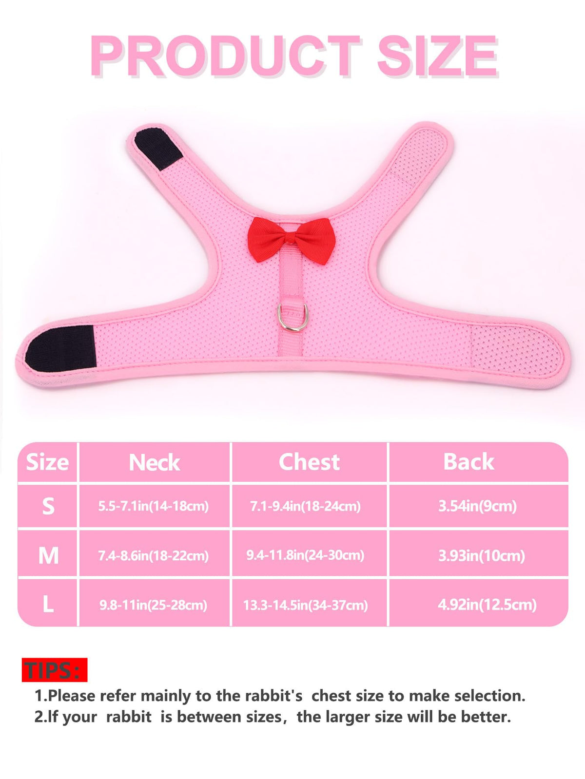 Rabbit Harness And Leash Set For Walking Escape Proof , Mesh Breathable Adjustable Rabbit Leash Camping Hiking Training For Ferret Kitten Puppy Size :Small Neck Girth:5.5''-7.1'',Chest Girth: 7''-9.4'', Back Length: 3.54'' ; Meidum Neck Girth:7.4''-8.6'',Chest Girth: 9.4''-11.8'', Back Length : 3.93''; Large Neck Girth:9.8''-11'',Chest Girth: 13.3''-14.5'', Back Length: 4.92'' . Suitable For Small, Medium And Large Rabbits, Also Suitable For Ferret, Kitten, Mini Dogs And Other Small Animals. (Please Measure The Pet'S Neck & Chest Circumference And Back Length Before Purchasing To Choose The Appropriate Size To Buy) Material:Rabbit Harness And Leash Set: The Rabbit Harness Is Made Of Soft Mesh, Which Is Light And Breathable, And Can Be Worn In All Seasons. The Rabbit Leash Is Made Of Nylon, Which Is Wear-Resistant And Can Be Used For A Long Time. Comfort :Fit Rabbit: The Neck And Chest Of The Rabbit Harness Are Designed With Hook And Loop For Easier Wearing And Adjustment. It Is Worth Mentioning That The Harness Of The Neck With Adjustable Strap And Safety Buckles To Prevent The Rabbit From Breaking Away The Harness And Escaping. Easy To Carry:This Small Animal Chest Carrier Has A Metal D-Ring On The Back, Which Can Be Quickly Wearing Steps: 1. Open The Hook And Loop On The Rabbit Harness ; 2. Close The Hook And Loop On The Neck And Chest In Turn; 3. Adjust The Strap On The Neck And Close The Safety Buckle. Note:If The Rabbit Is Wearing A Harness For The First Time, You Can Let The Rabbit Get Used To The Harness Indoors, Make Sure That The Rabbit Is Used To The Harness, And Then Fasten The Leash And Go Out Together.