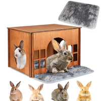Rabbit Hideout House Wooden Large Habitat for Bunnies Chinchilla Hamsters and Guinea Pigs Hut to Hide - Brown