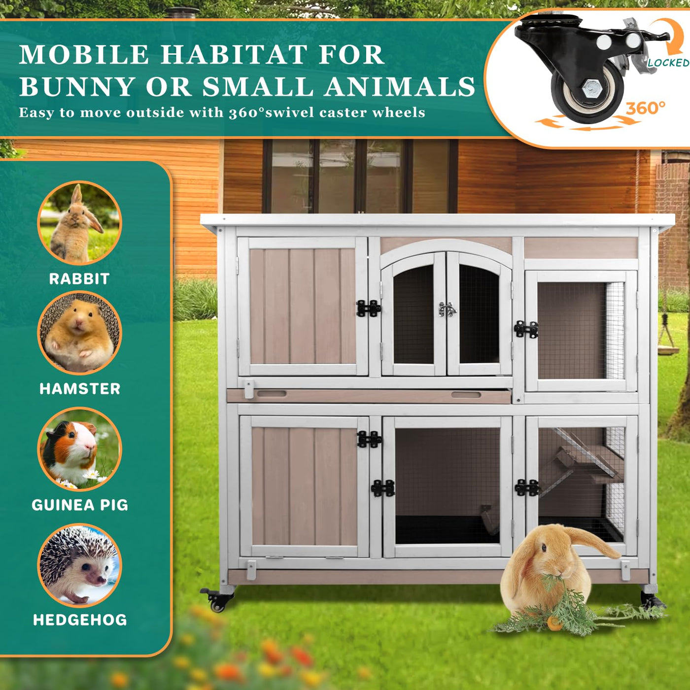 2 Story Rabbit Hutch Rabbit Cage With Two Deeper Pulls Out Trays That Wont Leak Off. A Generous Lip Prevents Urine, Water, And Whatnot From Spilling Over The Edges. Crafted From Solid Fir Wood Rabbit House With Anti-Slip Ramps, Our Indoor Rabbit Hutch Boasts Durability And An Appealing Appearance. 2 Levels Cage Provide Ample Space For Pets To Move Freely. The Large Ground-Level Run Allows Your Bunny To Enjoy The Sunshine,While The Upper Room Provides A Cozy And Secure Resting Space. 4 Different Sides Access Doors Allow Your Pets To Move In And Out With Ease,And Convenient Feeding And Interaction With Your Pets. Offering Large Space For 2-3 Rabbits ,Suitable For Both Indoor And Outdoor Use. This Bunny Cage Includes Instructions, Pre-Drilled Holes, And Numbered Parts, Making Assembly Easy. Both The Sleep Area And Run Place With Full-Coverage Waterproof Asphalt Roofs To Prevent Rain Leakage, Provide Dry Room For Your Furry Friends.