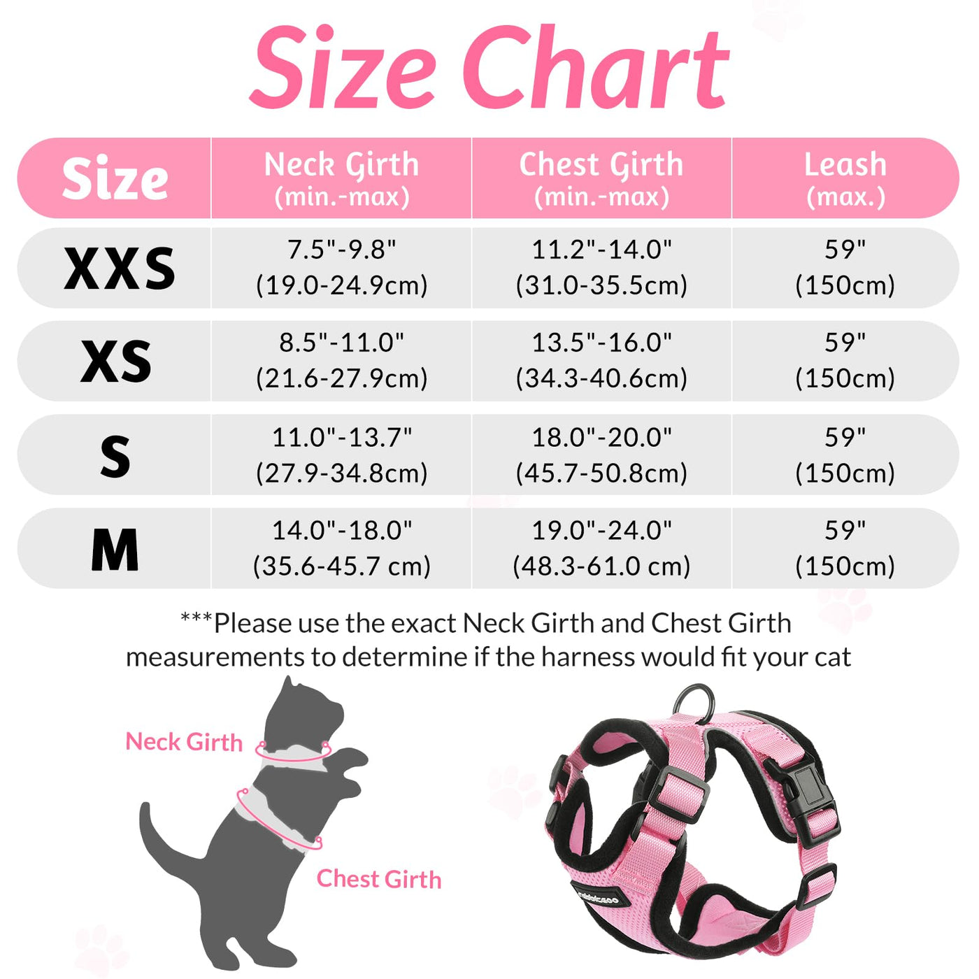 cat Harness with Leash Fits Average cats: Size measuring:Neck girth: 85 -11 Inches chest girth: 135 - 16 Inches Please measure your cat carefully and refer to the size chart before order (Tips: Your cats head circumference should be at least 10 inches or your cat may slip out) Package includes: 1x Small cat Walking Vest and 1x Walking Nylon Leash (150cm) comfortable Outdoor Harness: This real comfy cat harness will snugly fit your feline friends body while still keeping him or her cool with its breathable air mesh Soft and lightweight (approx 100g) suitable for daily walking jogging training and any outdoor recreations Also a perfect comfort harness when youAre taking your kitty to an unfamiliar place such as the vet or groomer Escape Proof cat Harness: This adjustable kitty harness features 4 adjusting straps which allow a just-right fit for your flexible cat Both sides have a sturdy safety buckle for a more secured closure - never worry about your cat getting lost during outdoor adventures (Tips: The harness should be snug enough for you to fit one finger between the straps and any part of your cats body) cat Safety Harness: You can attach the long sturdy nylon leash to the metal leash clip on the back allowing your kitty to explore the great nature safely and enjoyable Its vest-style design can evenly distribute leash pressure across the chest and shoulder to prevent choking or neck strain which is much safer and more comfortable than a basic halter or H-style harness The reflective strips will keep your kitty always visible in dark environments Hassle-Free Overhead Harness: This easy-wearing harness is simple to put on and take off with 2 snap side-buckles and 4 fully adjustable straps (Tips: To help your sensitive friend get familiar with this new feeling of wearing a harness try to place it near your cat during sleeping or feeding time)