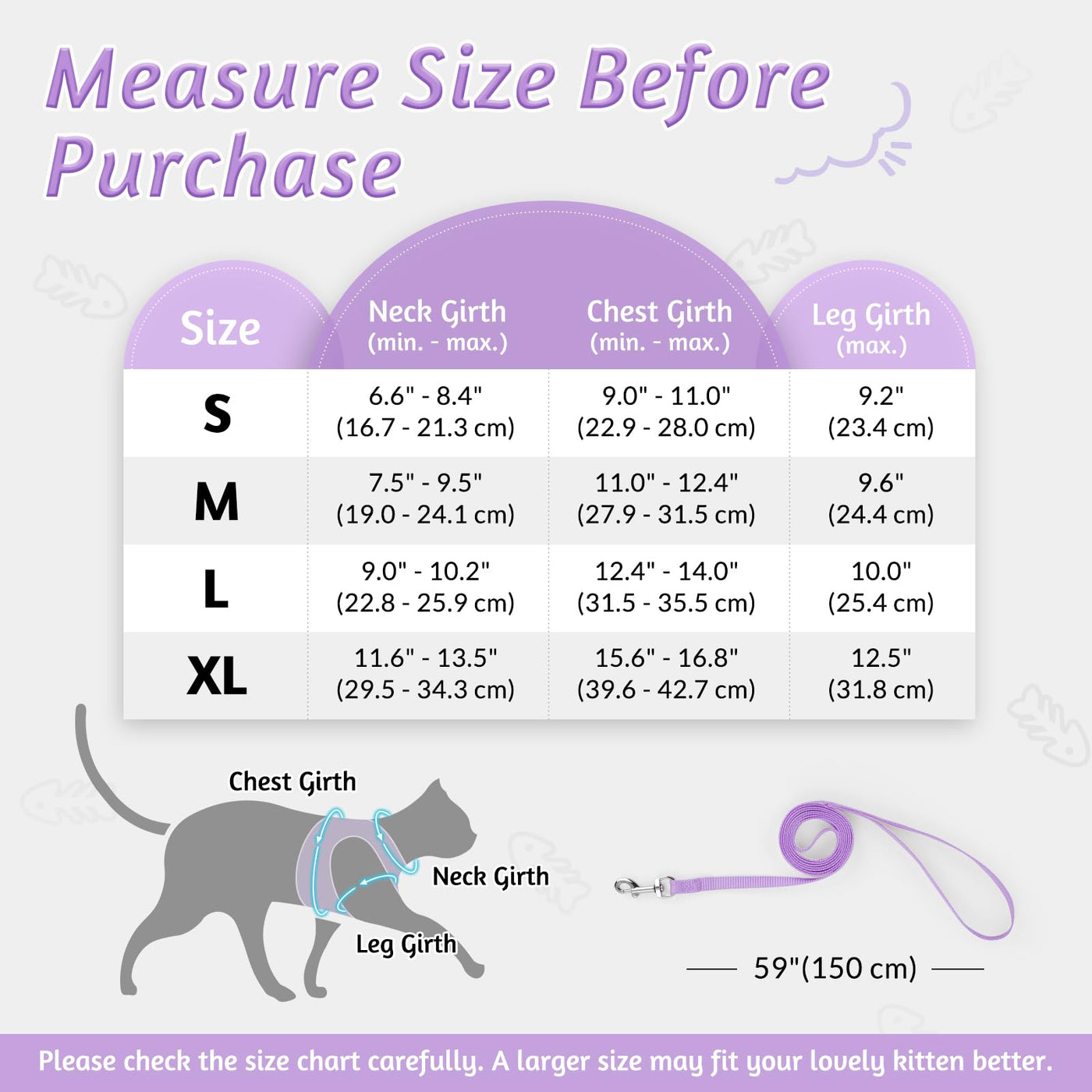 Fits Perfectly: Neck girth: 90 - 102(228 - 259cm) chest girth: 124-140( 315 - 355 cm) Please accurately measure your cat and carefully select a harness by referring to the size chart For a better fit for your adorable kitty it is suggested that you choose a larger size Package includes: 1 * cat harness & 1 * nylon leash (59 inch) No Escape Again: This cat harness with leash set features the magic tape and back buckle design for secure closure to stop the cat slip out And the vest-style design protects the neck of your cat against the pull and strain of a collar You can share enjoyable walks exercise and playtime outside with your kitty now Super comfortable: This real comfy harness is made of superior fabric with soft edge and air-mesh padding which can effectively prevent injuries giving extra comfort and protection With this practical design our cat harness gives your four-legged friend a snug fit and lets him stroll along with style and comfort on his daily walks Improved Safety Design: The fast-release buckle and metal D-rings for leash attachment ensure that your cat will stay securely in the harness while you are out on your daily walks For additional safety our escape-proof cat harness has reflective strips design which can keep your kitty always visible even at night Easy to Wear and Adjustable Harness: Made for convenience and function the vest design makes this harness easy to get on and off And the adjustable strap creates a Perfect Fit for your kitty with some room of growth (Tips: Please give your cat some time to get familiar with this harness for the first time use)
