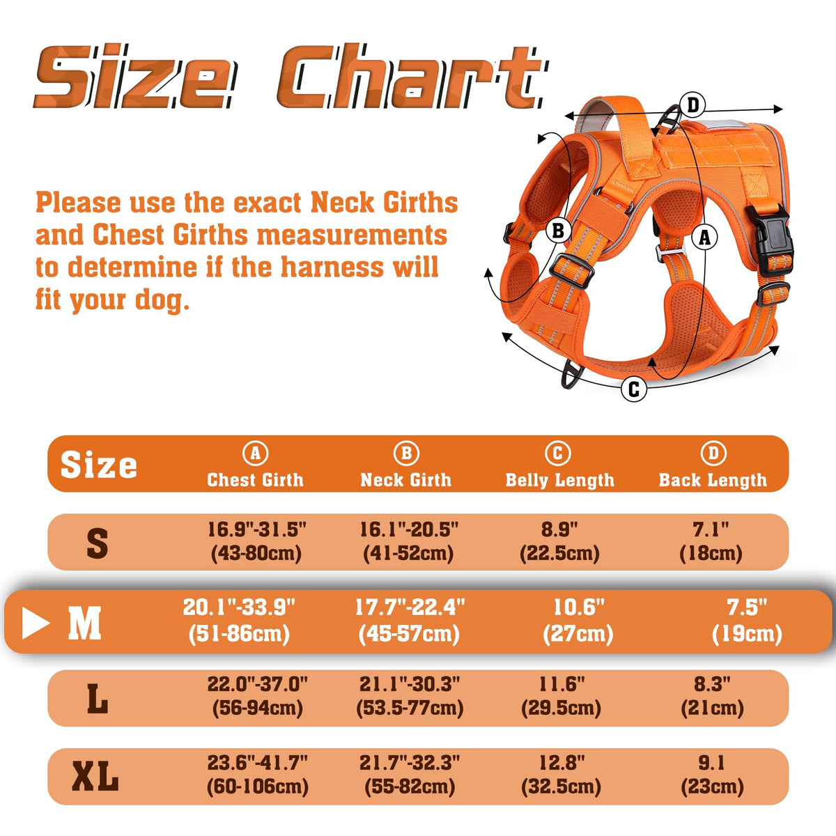 Medium Tactical Dog Harness: chest girth: 201-339 (51-86cm) Neck girth: 177-224 (45-57cm) Belly Length: 106 (27cm) Back Length: 75 (19cm) Ideal for Pitpull Boxer cane corso Labradoodle Australian Shepherd corgi Bull Terrier cairn Terrier etc Easy to Adjust & Wear: The tactical dog harness features 4 convenient adjustment points (2 Shoulder 2 chest) to ensure a snug fit for dogs of all sizes Two quick-release buckles are designed not only for easy on and off but also can withstand great pulling force providing security for training hunting walking and any other occasions Ultra Safety Design: The reflective trims all around the tactical dog harness for optimal visibility and security at night Two secure metal leash attachments for different occasions Daily back clip for well-trained dogs casual walking or jogging No-pull front clip helps discourage your dog from pulling More DIY Space: MOLLE system equipped on both sides of the tactical harness for pouches water bottles and outdoor gears You can attach personalized badges morale patches on the hook & loop panels Insert the ID card into the card slot to identify your dog Widely used for personal service law enforcement hunting or outdoor recreation Super comfy Padding: The tactical dog harness with soft breathable air mesh is gentle and skin-friendly to keep your baby cool and comfortable during outdoor activities The reinforced handle is equipped with a thicker and wider padding which allows you with maximum comfort and additional control when your dog gets inout of the car