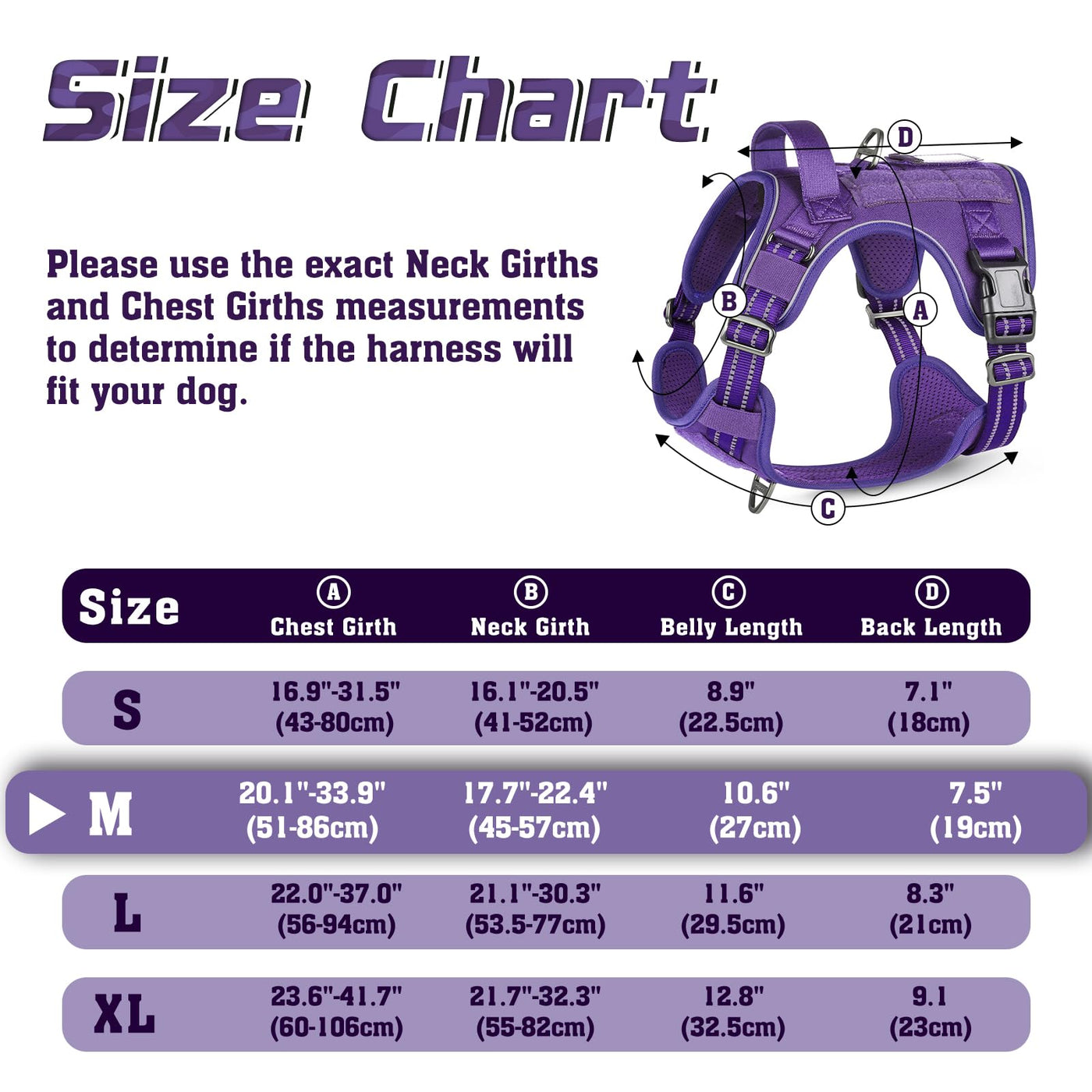Medium Tactical Dog Harness: chest girth: 201-339 (51-86cm) Neck girth: 177-224 (45-57cm) Belly Length: 106 (27cm) Back Length: 75 (19cm) Ideal for Pitpull Boxer cane corso Labradoodle Australian Shepherd corgi Bull Terrier cairn Terrier etc Easy to Adjust & Wear: The tactical dog harness features 4 convenient adjustment points (2 Shoulder 2 chest) to ensure a snug fit for dogs of all sizes Two quick-release buckles are designed not only for easy on and off but also can withstand great pulling force providing security for training hunting walking and any other occasions Ultra Safety Design: The reflective trims all around the tactical dog harness for optimal visibility and security at night Two secure metal leash attachments for different occasions Daily back clip for well-trained dogs casual walking or jogging No-pull front clip helps discourage your dog from pulling More DIY Space: MOLLE system equipped on both sides of the tactical harness for pouches water bottles and outdoor gears You can attach personalized badges morale patches on the hook & loop panels Insert the ID card into the card slot to identify your dog Widely used for personal service law enforcement hunting or outdoor recreation Super comfy Padding: The tactical dog harness with soft breathable air mesh is gentle and skin-friendly to keep your baby cool and comfortable during outdoor activities The reinforced handle is equipped with a thicker and wider padding which allows you with maximum comfort and additional control when your dog gets inout of the car