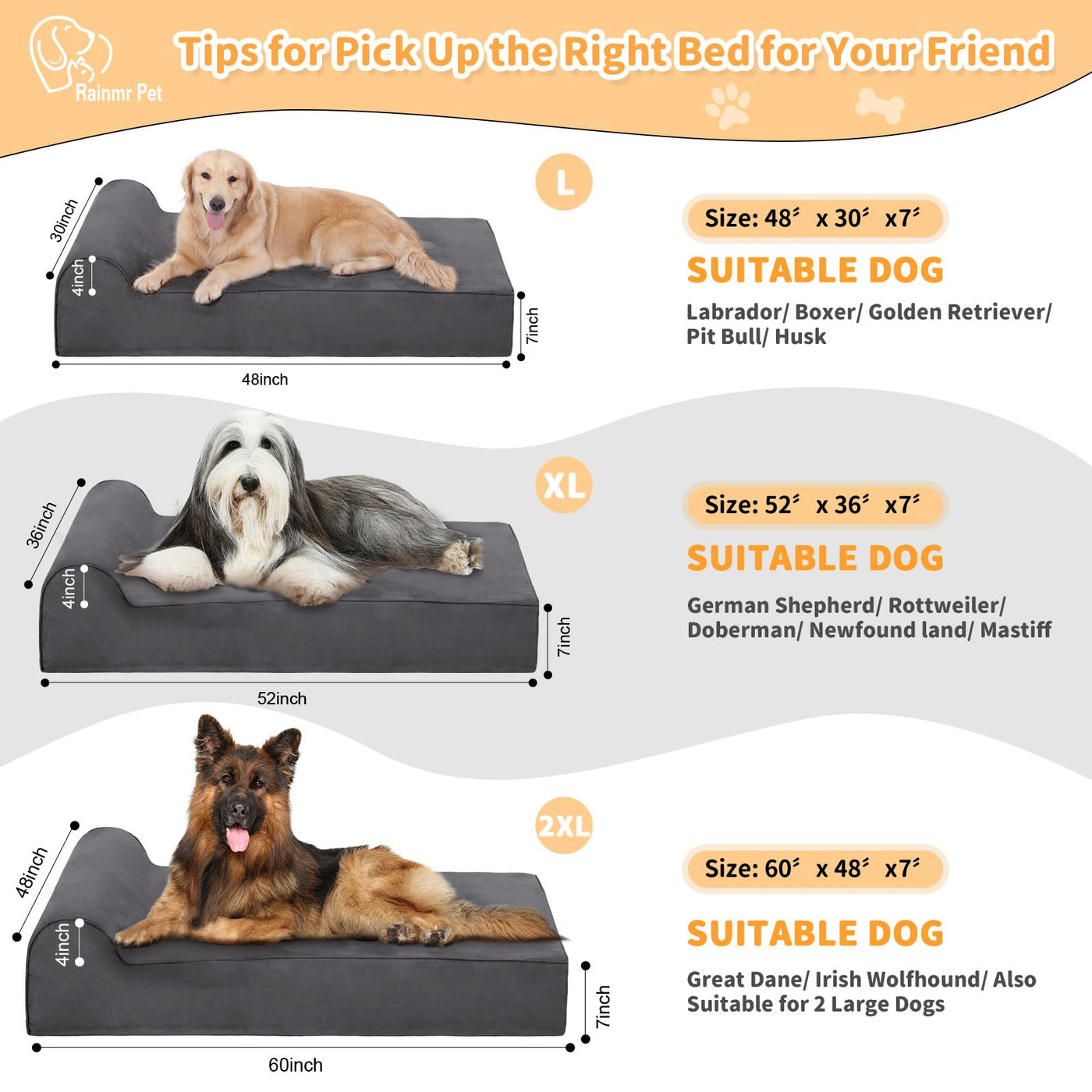 Big Dog Beds: Advantages And Features ?Ultra-Soft & Waterproof?The Orthopedic Dog Bed'S Surface Is Made Of Ultra-Soft Microsuede Material. The Thick Dog Bed Is Soft, Skin-Friendly, And Helps The Dog Fall Asleep Quickly. The Tpu 100% Waterproof Layer In The Middle Can Effectively Prevents Liquids From Penetrating Inside. ?Easy To Clean?The Dog Bed'S Washable Cover Is Waterproof, Removable And Machine Washable, Making Cleaning The Pet Bed Very Convenient. Dog Bed For Large Breed With A Durable U-Shaped Zipper, Making It Very Easy To Remove And Wash. ?Strong Support?Our Extra Large Dog Beds Are Made Of Thick, Highly Elastic Foam Sponge, Providing Excellent Elastic Support And Long-Lasting Recovery Ability. Dog Beds For Large Sized Dog Offer Good Softness And Support, Helping To Relieve Body Pain And Joint Pain. Big Dog Bed Multiple Sizes: 1) Dog Bed L: 48''X30''X7'' 2) Dog Bed Xl: 52''X36''X7'' 3) Dog Bed Xxl: 60''X48''X7'' Material: 1) Filler Material: High-Density Memory Foam 2) Dog Bed Outer Cover: Soft Microsuede Material 3) Waterproof Layer: Tpu 4) Bottom: Non-Slip Bottom 5) Zipper Features: U-Shaped Zippers, Durable Zipper