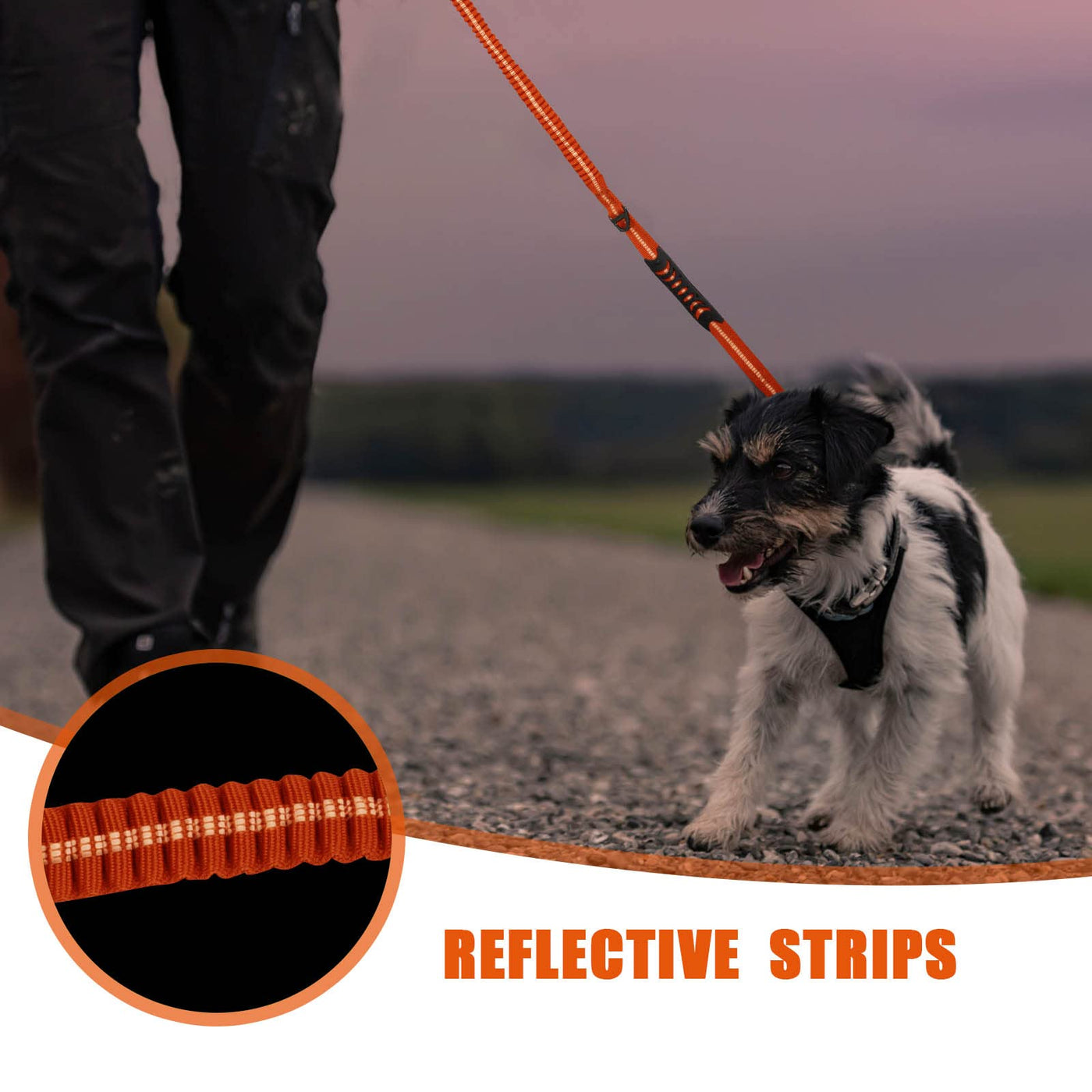 Q: How does the bungee feature work on this dog leash?A: The bungee feature utilizes Zero Shock-Absorbing Technology, allowing the leash to stretch an additional 2 feet. This design helps dissipate force, protecting your dog from sudden pulls and providing a more comfortable walking experience.