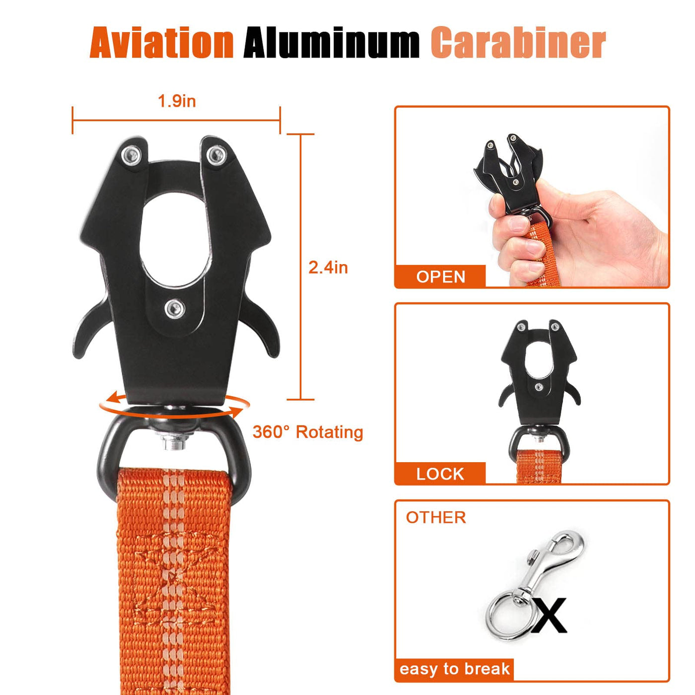 QUIcK RELEASE cARABINER The 360A Rotating Frog clip is made of Aviation Aluminum can hold up to 400 pounds Quick release and locking dog leash buckle while holding tight under strong pull 360Arotatable to prevent the dog leash from twisting and knotting ULTI-PURPOSE HANDLE:2 different handles are designed on this bungee extension dog leash The Padded Easy Walking Handle is more suitable for your daily dog walking The Traffic control Handle is more suitable for training your dog to prevent pulling or encountering special situations (such as cars approaching crossing sidewalk) ELASTIc BUNgEE LEASH: This Anti-Pull chew Proof pet leash is designed with Zero Shock-Absorbing Bungee Technology can be stretched for an additional 2 feet Dissipate most of the force and protect the dog that runs suddenly SAFE & cONVINENT DESIgN:Three highly Reflective Threads have been added to the entire power stretch leash to ensure the safety of you and your dog at night1 D-ring near the training control handle to hang dog walking accessories Designed with 1 seat belt buckle to keep your dog safety while you driving STURDY & DURABLE cRAFT:This 4in1 strong multifunctional pet leash is made of WEAR TEAR-RESISTANT Nylon Material For medium and large dogs we made 6 AX-shapedA reinforcement stitches on the whole dog rope Tough enough to withstand the pulling force of large breed dogs up to 150 LB