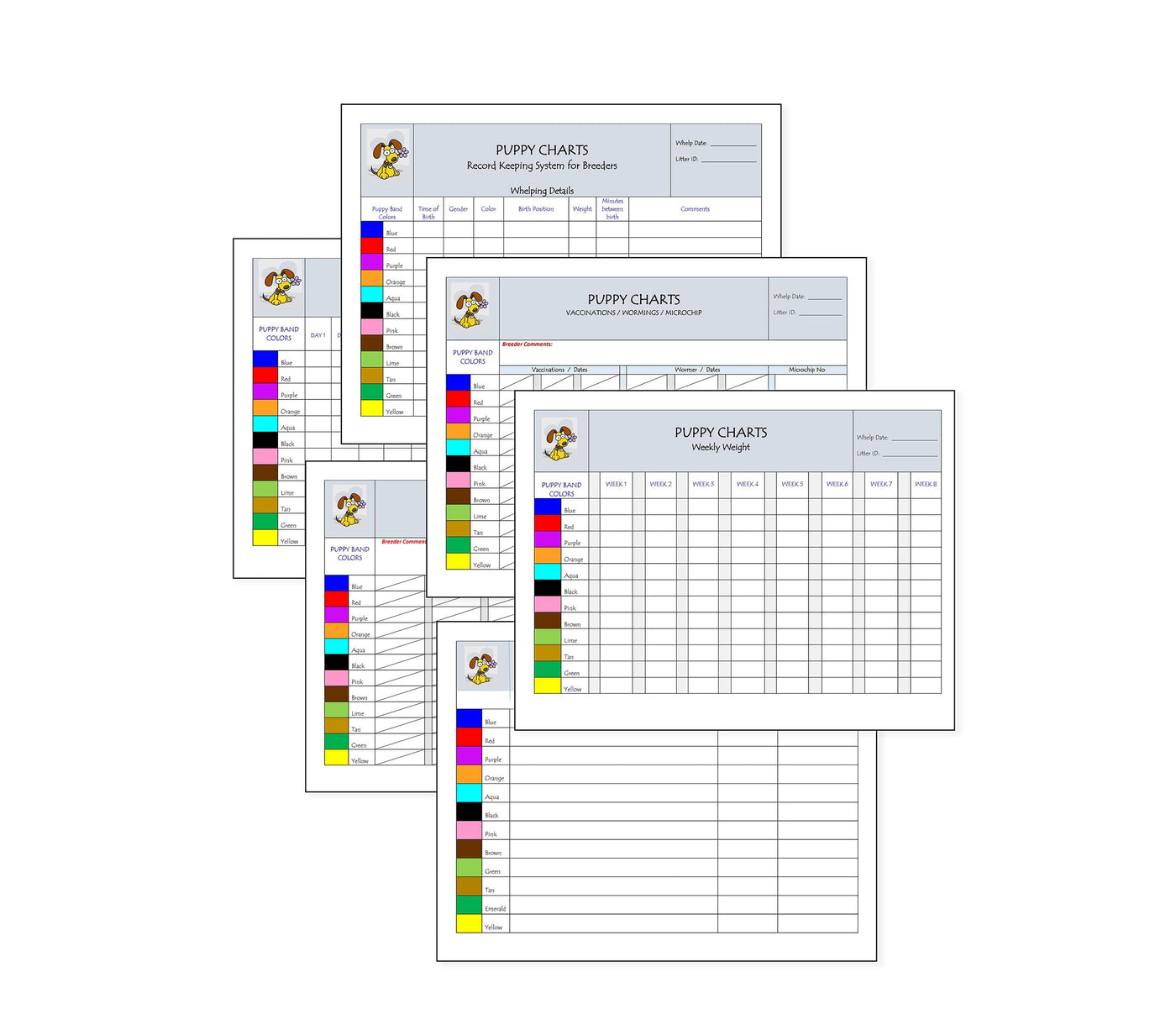 Q: How many charts are included in the set?A: This listing includes one set of six different puppy litter charts, allowing breeders to maintain organized records for each individual puppy.