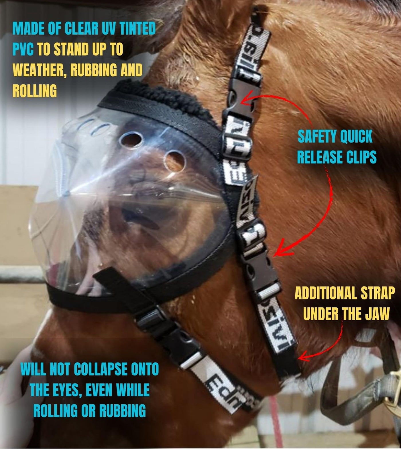 Superior alternative to the EyeSaver. Horses recovering from eye surgery or injury or wounds, suffering from uveitis, corneal ulcers, glaucoma, photosensitivity. Blindness or lost vision in one eye and need to ensure superior protection for the one remaining eye. Used for trailering to prevent injury from dust and debris for a horse with no eye problems. The solution is the EquiVizor recovery vizor. Suitable for barn or pasture use. Published in the leading equine ophthalmology text book, 3rd Ed., by Dr. B. Gilger noted for providing advanced protection to the eyes post-surgery or for chronic eye conditions. Industry first design includes quick release safety breakaway clips. Comes included with a matching fly mask jacket. The dark tint option is 90% UV tinted with a 30% greater shade factor for extra photosensitive horses. As the US distributor, Protective Pet Solutions provides exceptional customer service, before, during and after the sale to ensure your horse receives superior protection. Should you have any questions on sizing, please contact us prior to ordering. Note: The recovery vizor material has been tested to hold up to temperatures down to 0F. Exposure to temperatures below zero will result in cracking. Additionally, horses bumping the recovery vizor into objects below freezing may also result in cracking.