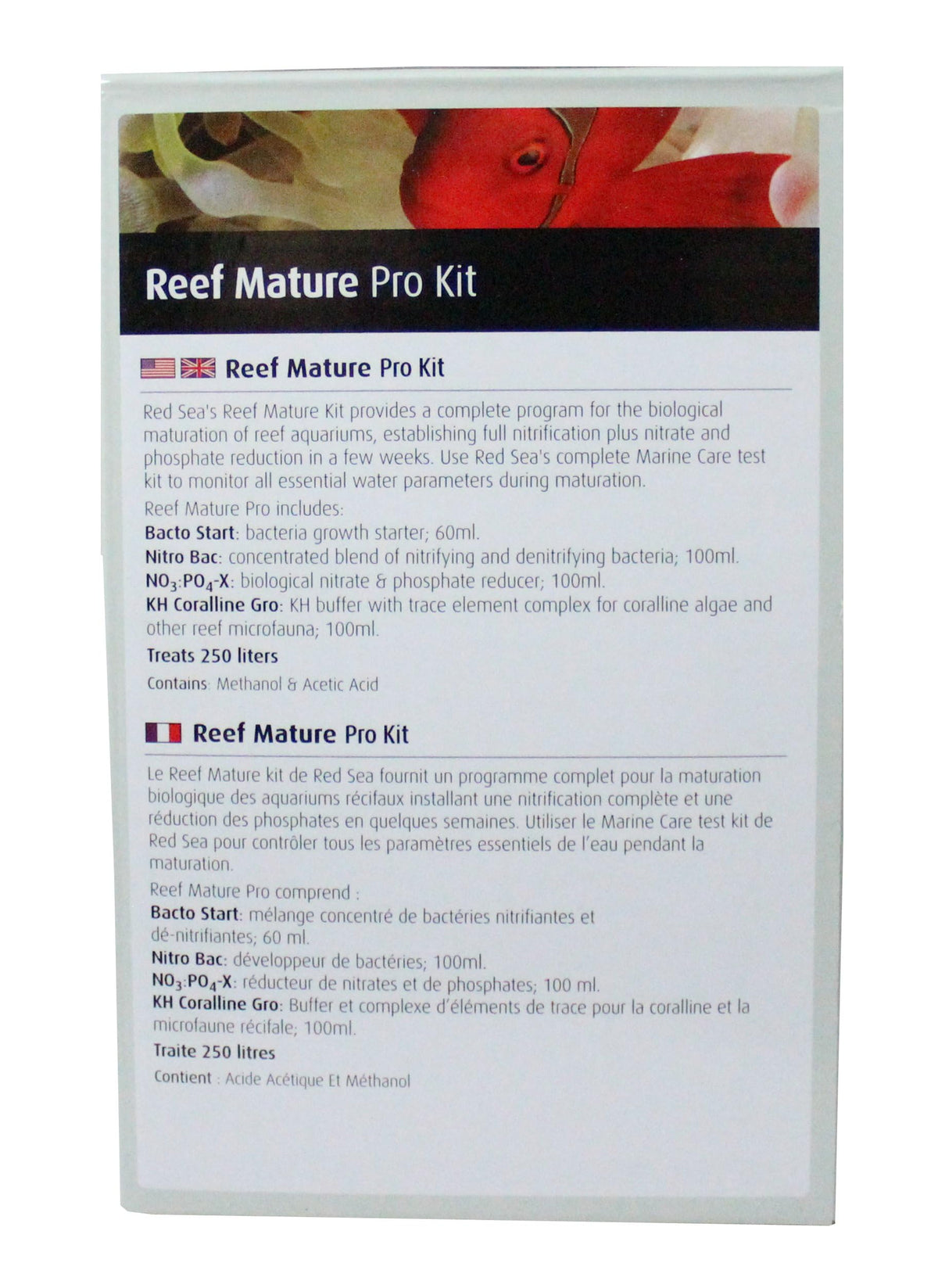 Red Sea Fish Pharm - Reef Mature Pro Kit. Consists of 4 supplements for completing the maturation process for a 250 liter system nitro bac, bacto start, no3 po4-x kh-coralline gro.