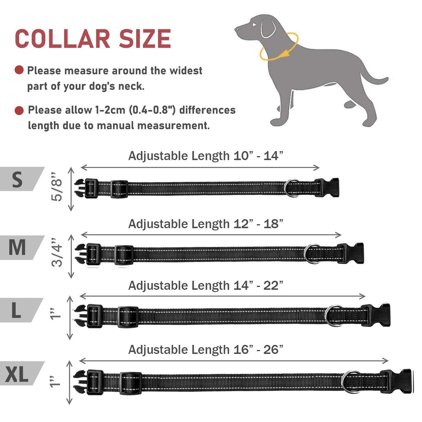 Q: What sizes are available for the Reflective Dog Collar?A: The Reflective Dog Collar comes in four sizes: Small (5/8" width, neck circumference 10-14"), Medium (3/4" width, neck circumference 12-18"), Large (1.0" width, neck circumference 14-22"), and Extra Large (1.0" width, neck circumference 16-26"). Please measure your dog's neck to choose the correct size.