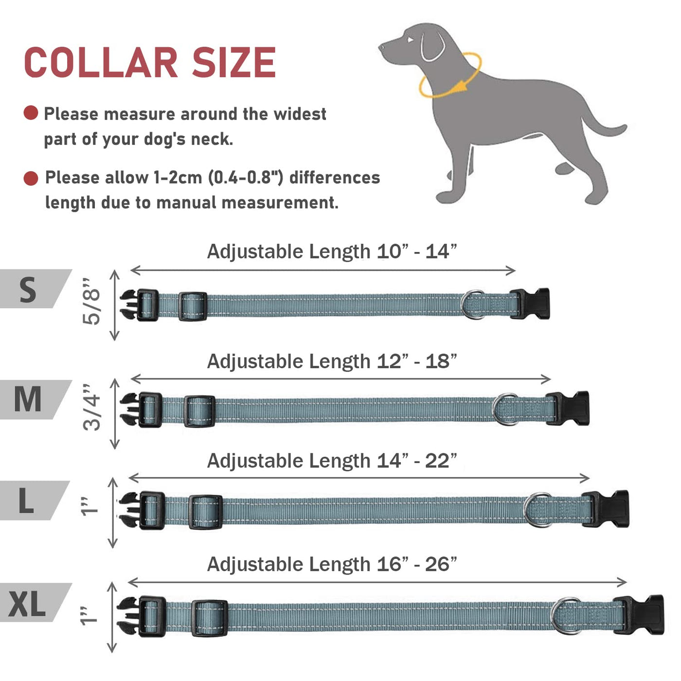 Q: What sizes are available for the Reflective Dog Collar?A: The Reflective Dog Collar is available in four sizes: Small (5/8" width, neck 10-14"), Medium (3/4" width, neck 12-18"), Large (1.0" width, neck 14-22"), and XLarge (1.0" width, neck 16-26"). Make sure to measure your dog's neck circumference before ordering to ensure the correct fit.