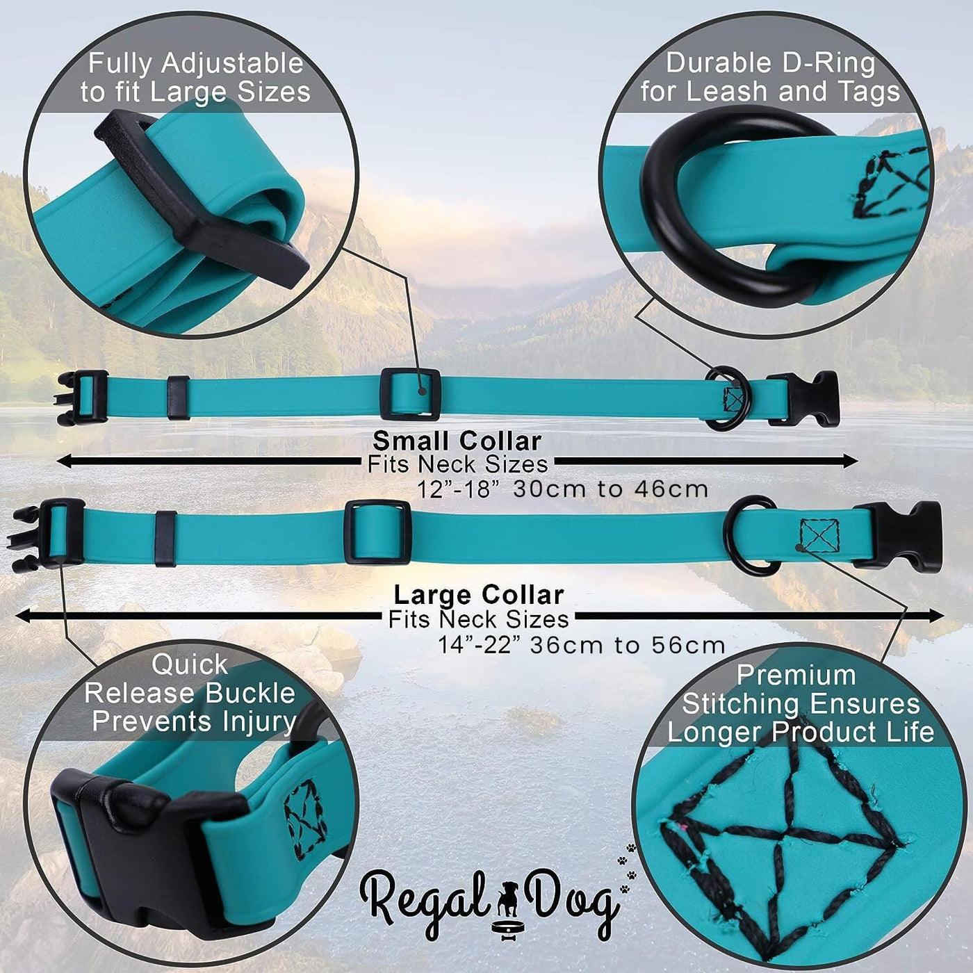 Q: What sizes does the Regal Dog Products Teal Waterproof Collar come in?A: The Regal Dog Products Teal Waterproof Collar is adjustable and fits small, medium, large, and big dogs. The collar for small dogs ranges from 12" to 18" in length and is ¾" wide, while the collar for large dogs ranges from 14" to 22" in length and is 1" wide.