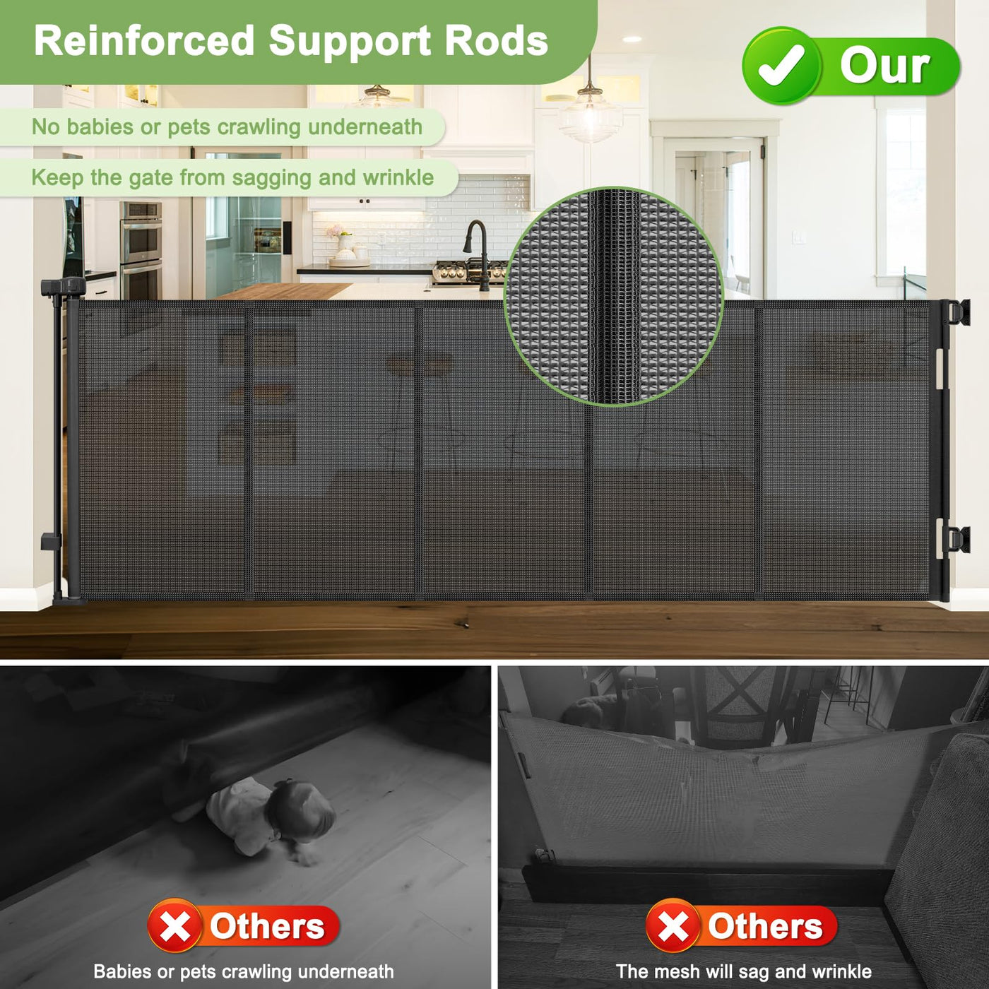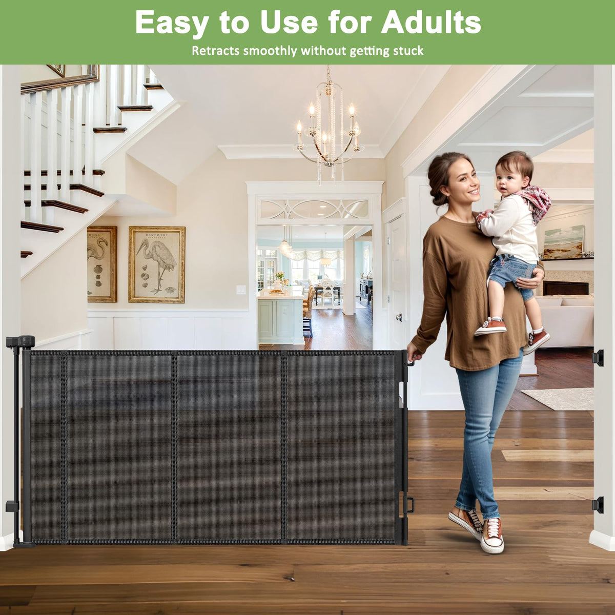 Retractable baby gate 1.Retractable baby gate could be fast install in minutes. 2.Retractable mesh gate is a sturdy and safety barrier that provides a safe and comfortable environment for babies and pets. Adjustable Latches to Fit Different Skirting Line The height of the lower bracket can be adjusted to perfectly complete the installation without damaging the skirting line. Suitable for use locations Stairs, bedrooms, kitchens, living rooms, etc. One handed operation to open and close the gate