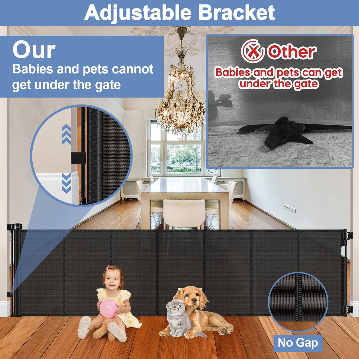 Upgraded Extra Wide Retractable Gate Reinforcement Strip Design - the mesh wont sag Adjustable bracket - babies and dog cant get under the extra wide retractable gate Upgraded Spring - retract smoothly Reinforced Strip Design - the mesh wont sag : We put reinforced straps in the mesh so that the top of the mesh doesn't sag and the bottom can't be lifted. Adjustable bracket - babies and dog cant get under the retractable gate : extra wide retractable baby gate bracket can be adjusted up and down to install over the baseboard.There is no gap between the retractable dog gate and the floor, so children and pets cannot get under the retractable pet gate. Upgraded Spring - retract smoothly : we have thickened the spring of the extra wide baby gate to make them more stretchy. The extra long baby gate retracts smoothly without getting stuck and the mesh won't wrinkle. 150 Inch Extra Wide Retractable Gate :extra wide dog gates for doorways is 33'' tall, suitable for 0-150'' wide openings. The mesh can be completely rolled up when not in use and does not take up space. Indoor / Outdoor Gate : extra wide pet gate can be used as kitchen gate, living room gate, doorway gate, bottom of stairs gate, fireplace gate, garage gate, porch gate, deck gate, patio gate, backyard gate. Suitable for Babies/Dogs/Cats : the mesh is scratch-resistant, soft and durable. Prevent your kids from climbing the Reinforced gate and pets from tearing the mesh with their claws. Provide a safe environment for your babies, dogs and cats. Easy to Use for Adults : the extra large baby gate can easily open and close the gate with one hand while holding the baby. Easy to open for adults, but difficult for babies.