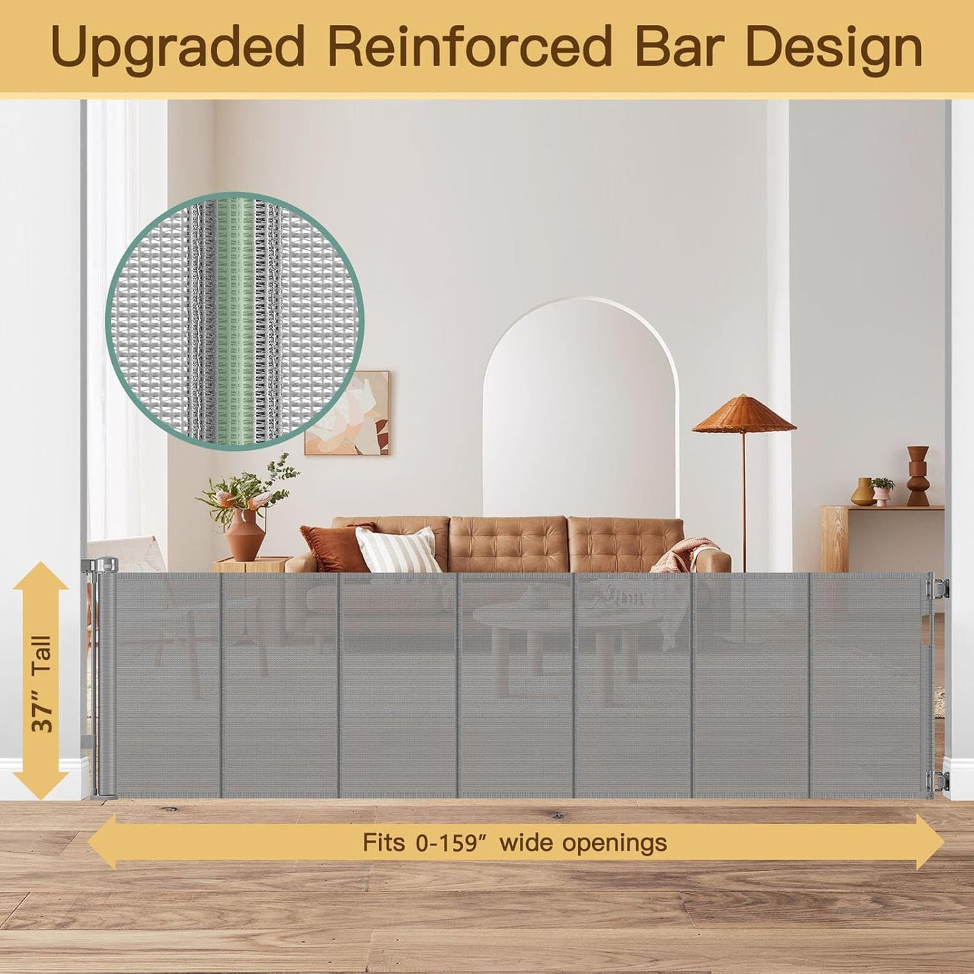 159 Inch Extra Wide Retractable Baby / Pet Gate with Reinforced Bars The top of the mesh wont sag and wrinkle Prevents Bottom Drilling Through Baby and Pet The retractable gate retracts smoothly and dont get stuck Reinforced Bar Design: we have added 6 reinforcement bars in the retractable baby gates. 1. The mesh does not sag or wrinkle. 2. The bottom of the extra wide baby gate is difficult to lift, and prevents children and dogs from squeezing between the extra wide gates and the floor. 3. The extra wide retractable baby gate retracts smoothly and doesnt get stuck. 37 Tall X 159 Extra Wide Retractable Gate : extra long baby gate is 37 inches tall, suitable for use in indoor and outdoor openings from 0-159 inches wide. Retractable Design - Saving Space : extra wide retractable dog gate is retractable and when not in use, the mesh can be rolled up completely without taking up space and being unobtrusive. The extra wide dog gates allows parents to open and close with one hand, while children and pets cannot unlock the retractable pet gate. Easy for parents to Use : The extra wide dog gates allows parents to open and close with one hand, while children and pets cannot unlock the retractable pet gate. Suitable for Babies and Pets : extra long retractable baby gates provides a secure environment for both babies and pets. Its a versatile solution for keeping your loved ones safe and giving you peace of mind. Perfect for Indoor and Outdoor : extra large baby gate can be installed indoors and outdoors as a kitchen gate, living room gate, stair gate, deck gate, porch gate, doorway gate, patio gate, backyard gate, garage gate, RV gate to use. Prevent your baby and pet from opening gas stoves, outlets, doors, cabinets, and refrigerators:You just need to install this extra wide pet gate in your kitchen or living room, your children will not be able to touch the dangerous gas stove, outlets, and open the cabinets, door konbs, refrigerators .Your pet will not be able to damage your precious sofa. Adjustable Bracket - Fits Any Baseboard : outdoor retractable gate bracket can be adjusted up and downy to match any baseboard style seamlessly. Durable Scratch-resistant & Anti-climbing Mesh : the mesh material is durable and resistant to scratches and tears, preventing pets from tearing the mesh and babies from climbing the extra long retractable gates for dogs. No Tripping Risk & Easy to Vacuum : unlike the pressure mounted baby gate, there are no bar at the bottom to make it a tripping hazard or get in the way when you need to vacuum the carpets.