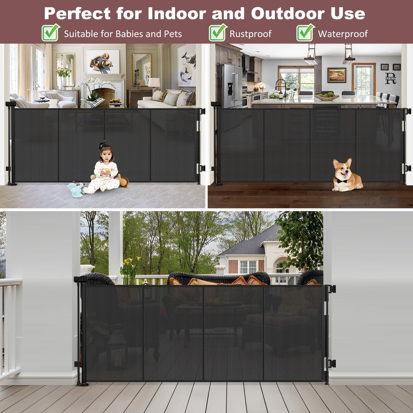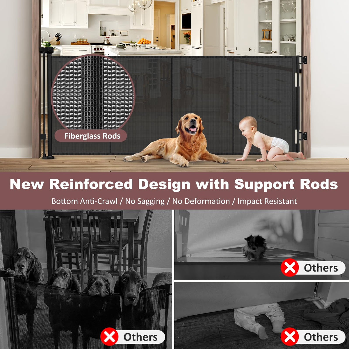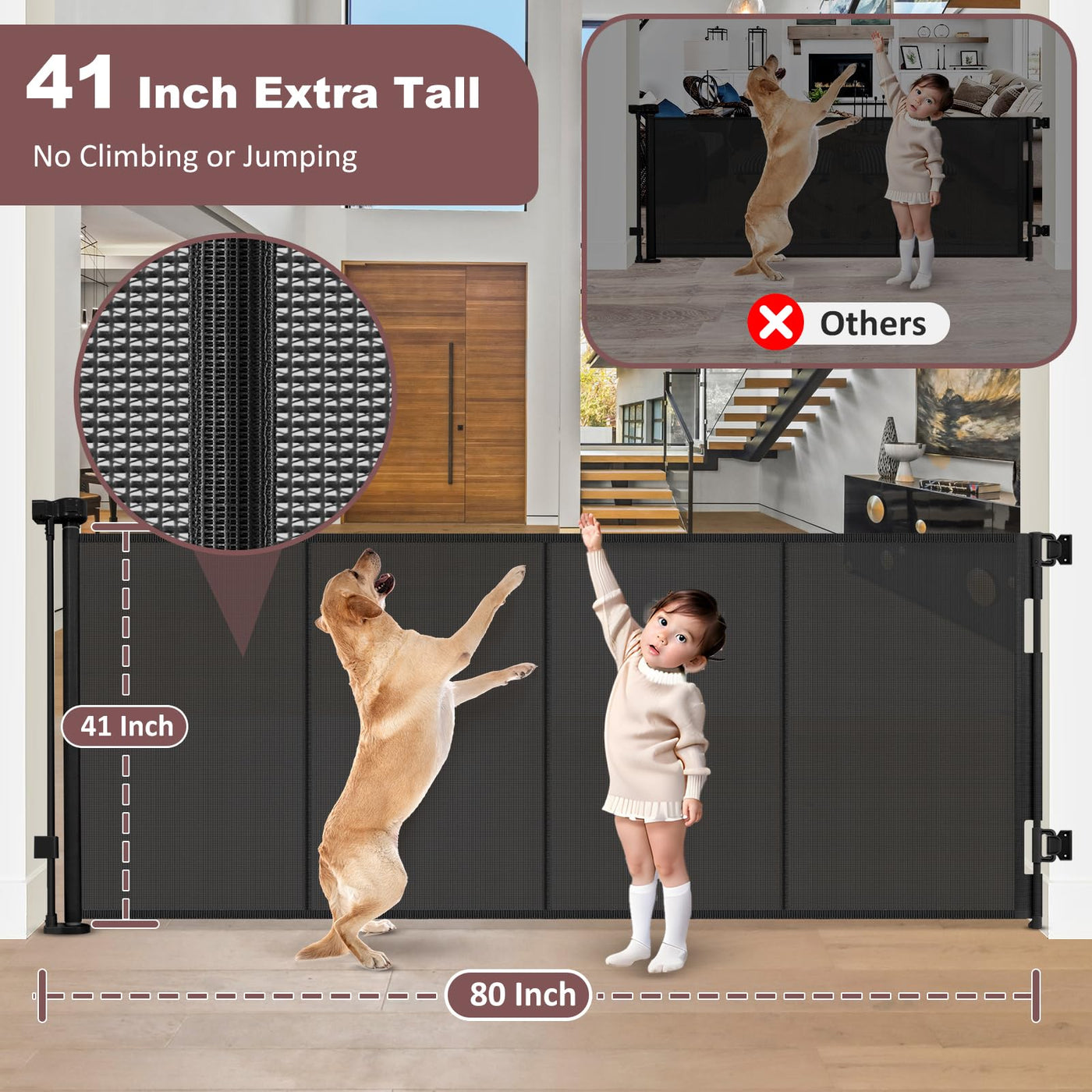 GRENFUs reinforced retractable baby gate and retractable dog gate is the perfect safety solution for homes with children or pets. Designed to fit seamlessly into any space, it offers strong, reliable protection both indoors and outdoors. Features: Reinforced 41-Inch Extra Tall Design 1. These retractable gates for dogs stand at 41'' tall, preventing babies and pets from crawling under or climbing over. 2. Equipped with support rods to stop top mesh sagging. 3. Ensures no deformation or wrinkles, strengthening mesh support. 4. Designed to resist impact. Adjustable Width 1. This tall mesh baby gate expands to fit openings up to 80 inches. 2. Offers flexibility for different spaces in your home. Space-Saving and Retractable 1. This extra tall pet gate for doorway retracts easily when not in use, saving space in high-traffic areas. 2. No bottom bar when retracted, no tripping hazards. Perfect for Indoor and Outdoor Use 1. Made from waterproof and rustproof materials. 2. Ideal for doorways, hallways, staircases, and outdoor areas like porches, patios, and decks. Sturdy and Scratch-Resistant Mesh 1. Soft yet tear-resistant mesh remains intact even with impacts. 2. See-through design allows monitoring while maintaining safety. Easy to Use 1. Safety lock enables adults to easily open and close the large baby gate with 1 hand. 2. Prevents accidental access by kids and pets. Fits Any Baseboard 1. Adjustable lower bracket moves up and down for seamless installation over baseboards. Easy Installation 1. This retractable outdoor gate is simple installation process with clear instructions, making setup quick and hassle-free. Certified to Standards 1. These tall pet gates for wide openings meet or exceed ASTM and EN safety standards, ensuring quality and reliability.