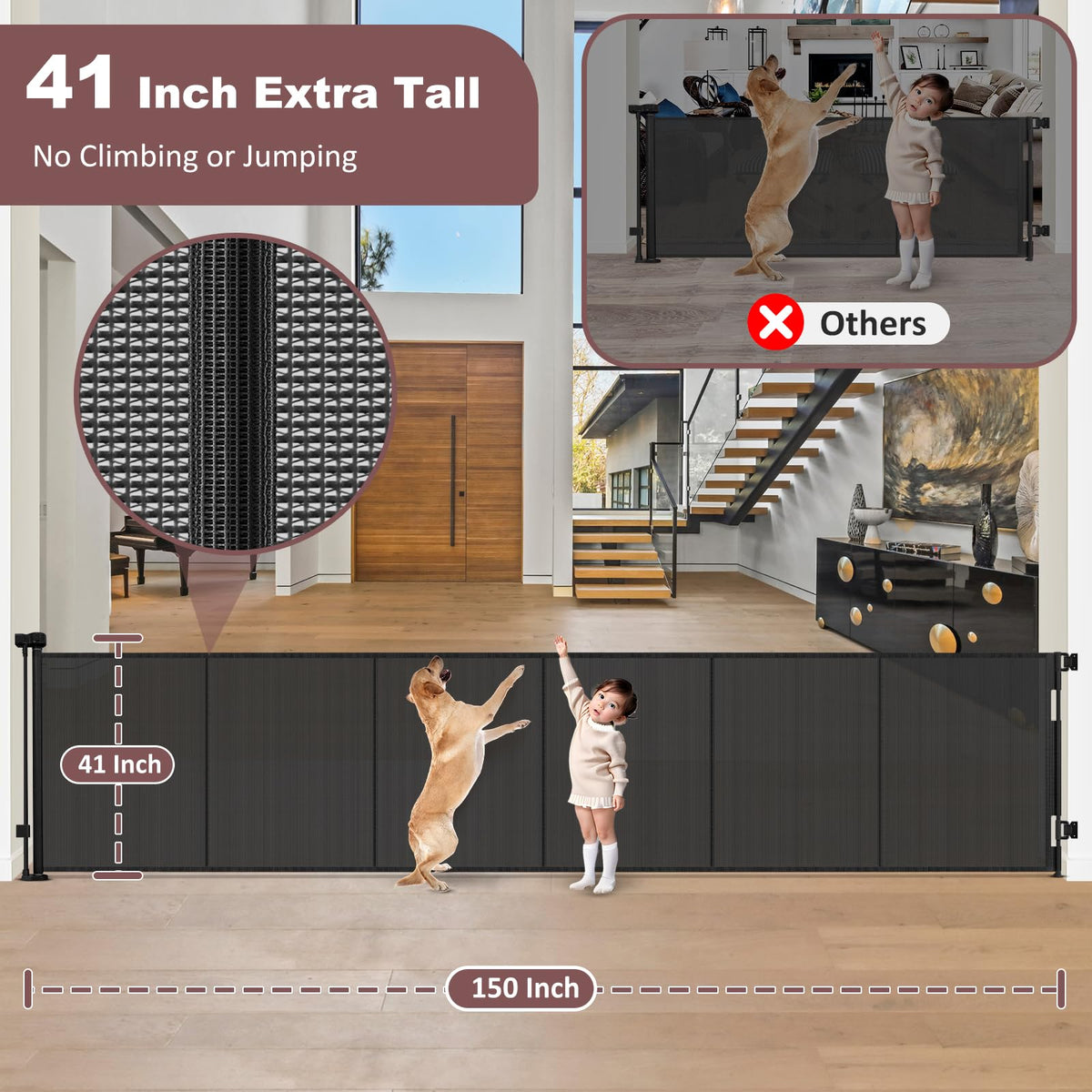 GRENFUs reinforced extra tall and extra long baby gate and extra long dog gate is perfect for homes with children or pets. Its height effectively prevents climbing, while the wide design covers large spaces like open-plan areas or wide doorways, creating a secure barrier for both indoor and outdoor use. Features: Reinforced 41-Inch Extra Tall Design 1. Standing at 41'' tall, these tall child gates for wide openings prevent babies and pets from crawling under or climbing over. 2. Equipped with 5 support rods to prevent the top mesh from sagging. 3. Maintains its shape with no deformation or wrinkles, enhancing mesh support. 4. Built to resist impact. Adjustable Width 1. This retractable fence outdoor gate expands to fit openings up to 150 inches (12.5 ft). 2. Provides flexibility for various spaces in your home. Space-Saving and Retractable 1. This extra tall pet gate for doorway easily retracts when not in use, saving space in high-traffic areas. 2. No bottom bar when retracted, no tripping hazards. Perfect for Indoor and Outdoor Use 1. Constructed from waterproof and rustproof materials. 2. Ideal for doorways, hallways, kitchens, and outdoor areas like porches, patios, and decks. Sturdy and Scratch-Resistant Mesh 1. Soft yet tear-resistant mesh remains intact even with impacts. 2. See-through design allows monitoring while ensuring safety. Easy to Use 1. The safety lock allows adults to open and close the retractable mesh gate with 1 hand. 2. Prevents accidental access by children and pets. Fits Any Baseboard 1. The adjustable lower bracket moves up and down for easy installation over baseboards. Easy Installation 1. These garage gates for dogs feature a straightforward installation process with clear instructions for a quick and hassle-free setup. Certified to Standards 1. These tall baby gates for doorways meet or exceed ASTM and EN safety standards, ensuring quality and reliability.