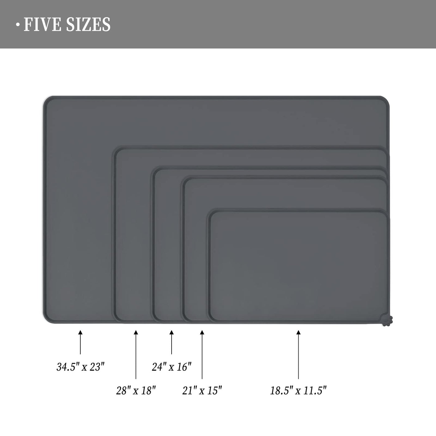 Q: What are the dimensions of the Reopet Silicone Dog Cat Bowl Mat?A: The Reopet Silicone Dog Cat Bowl Mat measures 21 inches by 15 inches, making it a perfect size for most pet feeding areas.