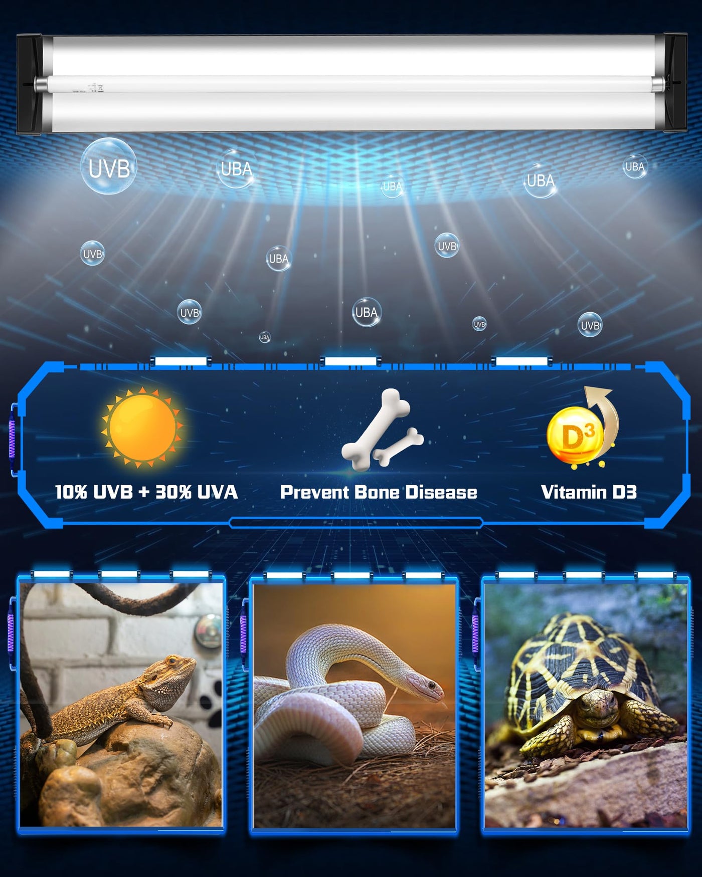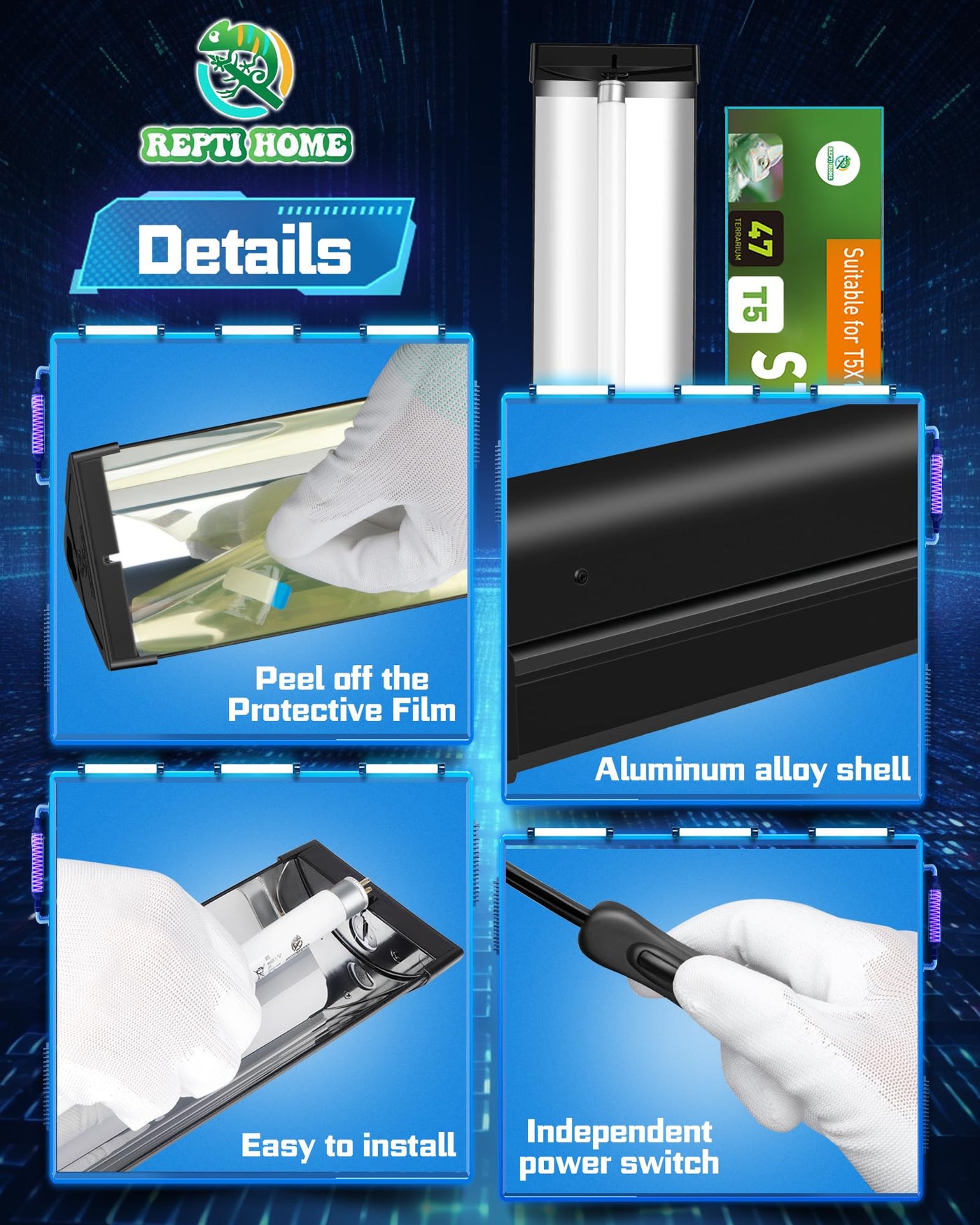 ?Safer 100V-250V Wide Voltage&Nbsp;?- T5 Uvb Reptile Light Fixture Adopting Upgraded Wide Voltage Technology, It Can Maintain Stability Between 100V-2500V, That Better Protect Our Lamp Tubes Compared To Ordinary T5 Reptile Lighting Fixture On The Market, Extending Their Service Life.&Nbsp;&Nbsp;?Perfect Combo Kit?- Repti Home T5 Uvb Reptile Lighting Combo Kit Including T5 10.0 Uvb Fluorescent Tube And Lamp Fixture, That Is The Ideal Choice For All Desert Dwelling Reptiles And Tropical Rainforest Reptiles, Providing Them With The Optimal Lighting Conditions They Need.&Nbsp;&Nbsp;?High Uva Uvb Output&Nbsp;?- Our Reptile Combo Kit Emits Uva Uvb Rays That Stimulate Optimal Calcium Metabolism, Activating Vitamin D3 And Promoting Bone Health.Powerful Uvb And Uva Output In Our Reptile Light That Doesnt Emit Harmful Uvc Rays, Ensuring Your Reptiles Receive The Necessary Rays For Their Overall Well-Being.