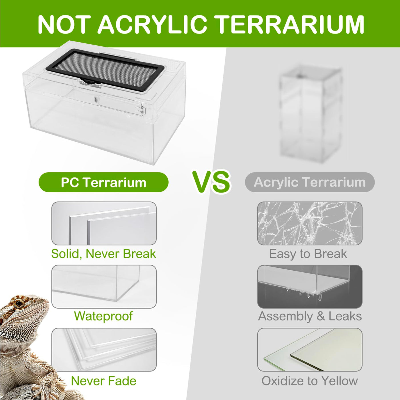 UNIQUE UNBREAKABLE MATERIAL: Different from the glass and arylic this tank made of high quality PC materials for sturdy and safe this terrarium tank is suitable for normal reptile amphibian pets as lizard crested gecko frog snake tortoise and more