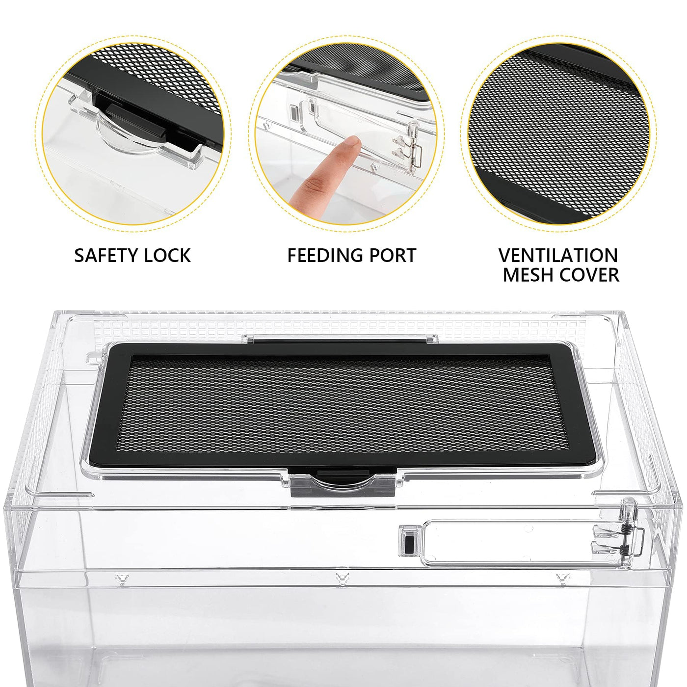 Package Include 1pc Reptile Terrarium Tank: Feature: Material:ABS Size:7x11.8x5.9inch Color: Clear Type: Reptile terrarium Unique design: 360 full view visually appealing No need to assemble it Removable mesh top Well ventilated holes With safety lock Convenient fedding port