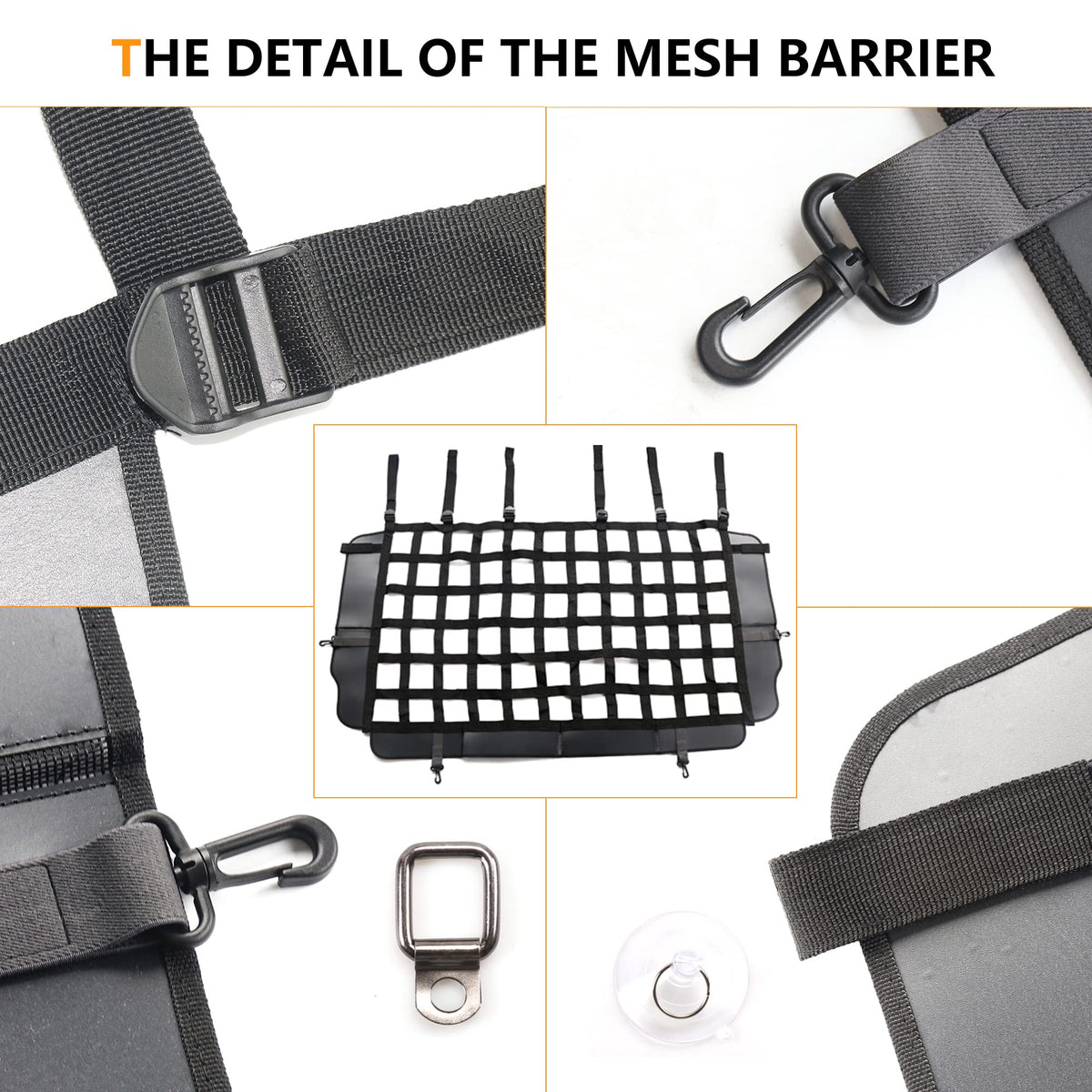 Q: What features make this dog barrier safe for my pet?A: This dog barrier includes upgraded features such as stronger PP boards at the edges, metal fixing clips, and suction cup fixing straps to effectively prevent pets from squeezing into the cab and ensure their safety during travel.