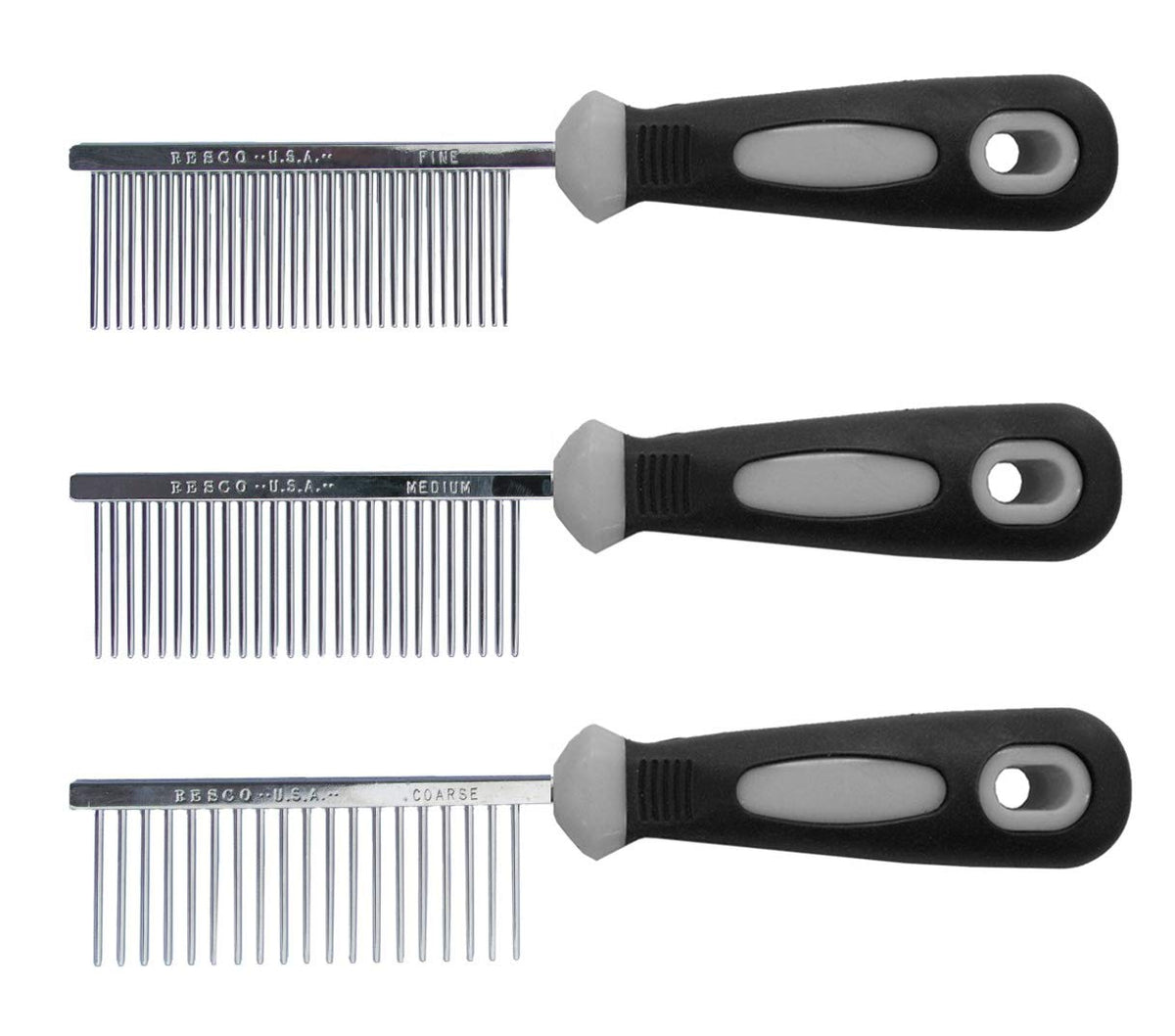 Since the early 1940s the American made Resco Pro Series combs have been a favorite amongst professional groomers and pet lovers. The 1” hardened steel pins are pressed into a solid brass shank to make sure the pins will never break or bend. The entire comb is then precision nickel plated. The black polypropylene handle is designed for comfort and control, while the teeth are tapered and rounded to allow for smooth gliding through any coat while also stimulating the skin. This anti-static comb comes in coarse, medium, and fine models – a tool for every occasion, from mat removal to finish grooming. Each comb comes in a variety of signature colors – pick the color that matches YOUR style!