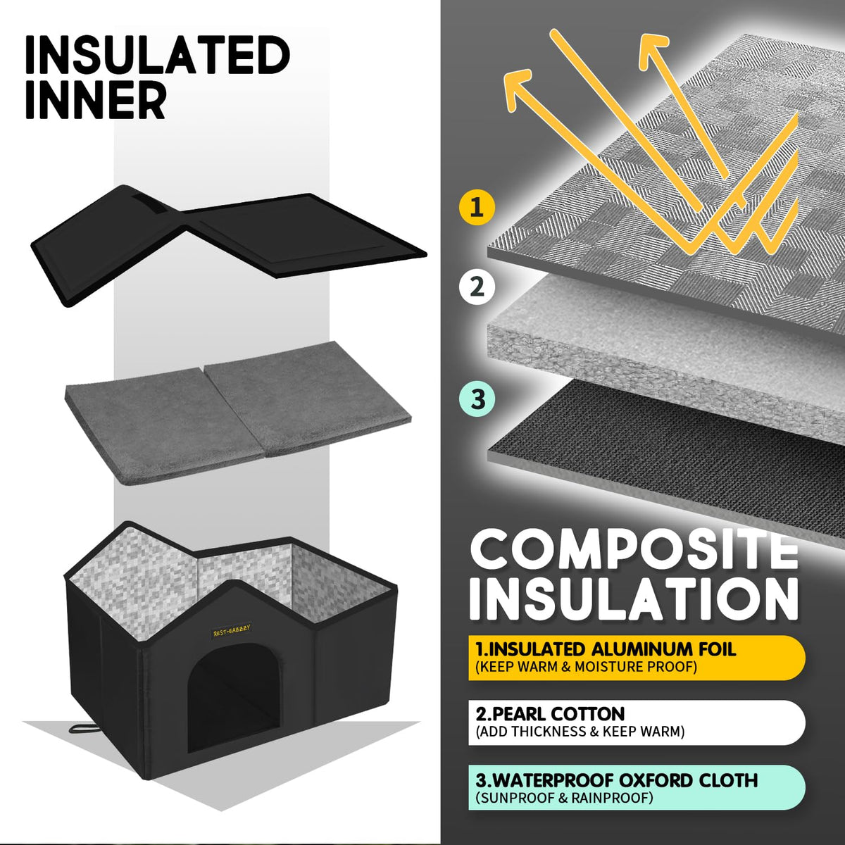ROBUST FRAME STRUCTURE The joints on the four sides of the feral cat shelters for outside have been reinforced, which can be restored to their original shape after pressing. Connect with Velcro for easier installation. WEATHERPROOF FUNCTION The outdoor cat house weatherproof is made of waterproof material. It will provide a waterproof function for the outdoor cat houses for feral cats on rainy days. Rain will slide off the surface and allow water to pass the bottom. Will keep the cat bed outdoor in the cat outdoor house dry well, especially on rainy days. KEEP PET WARMING The 13L x 13W x 14H cat outdoor tent with a reversible comfortable bed mat for all seasons and create a warm and comfortable accommodation environment for your beloved cats, puppies, rabbits and other pets in winter. KIND REMINDER 1.When you receive the new feral cat houses for outdoors at once, please ventilate it for a few days to reduce the peculiar smell. 2. The outside cat house may be thin and flat when you first get it because of the vacuum packaged. Just wait a few hours and the small dog house outdoor will regain its thickness and keep its shape.Specifications Size: 13L x 13W x 14HColor: camo green/camo grey/trea/black/grey/olive greenMaterial: waterproof oxford, insulating aluminum film, high-density foamPackage