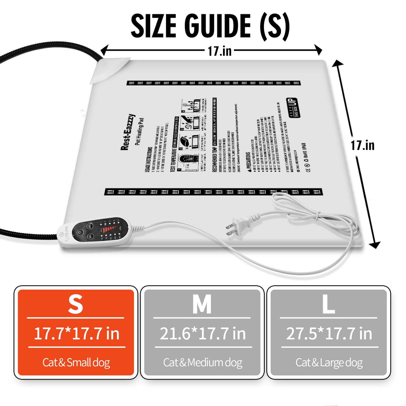 Rest-Eazzzy pet heating pad strictly abides by the safety standards of electrical appliances using low safety voltage. Moreover it is built in flame retardant cotton and equipped with temperature control device and automatic power off system to keep pets in safe in all aspects. The 18in x 18in cat warming pad is suitable not only for kittens, bunnies but also for small dogs. It promises pets a warmer and more comfortable bed when it is in ill or goes through the cold weather. Easy to use and easy to clean. Just plug in the power supply and adjust the switch to select the temperature you need. It can be timed and there are 5 time ranges to choose from: 4hours, 8hours, 12hours, 24hours and always on. 5-ranges temperature can be adjusted to meet different usage needs. We pay attention to the excellent quality hence we care more about the safety and health of every pet. We will devote to provide the best products and service for every pet in every family! Product Parameter Table Size:18” X 18“ Color: 6 patterns are available(please refer to the picture above for details) Temperature Range:5 adjustable temperature rangesTiming Setting: 5 gear timing options 3h/6h/12h/24h/always onSuitable Pet Type: cats and small dogs Inner Material: PVC Surface Material: flannel Wattage: Attention ? Keep the mat flat when you use it ? Don’t immerse the mat in water when it is heating ? Keep your pet away from chewing the cord. ? Remember to turn off the power when the pet leaves Package Includes 1 × Pet Heating Mat 1 × Flannel Covers 1 × Instruction