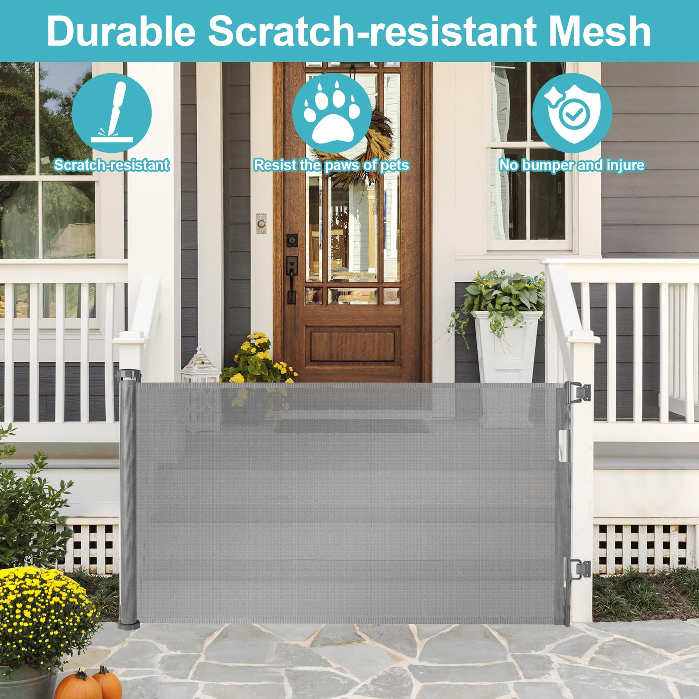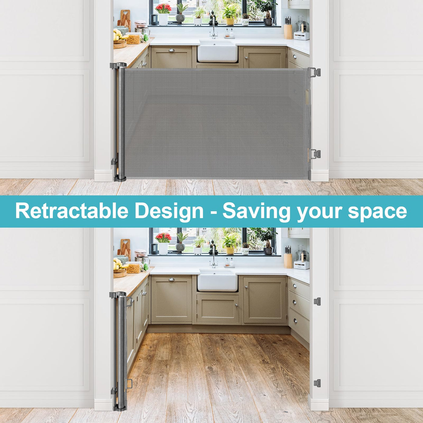 Feature Fits 0-55'' Wide Openings Suitable for Babies and Dogs Perfect Fit Indoor and Outdoor Retractable Design - Saving Your Space Durable Soft Anti-scratch Mesh Adjustable mount - Fit Any Baseboard One Handed Operation Fits 0-55'' wide openings : the height of retractable dog gate is 35 inches and the width is 55 inches. Retractable pet gate retracts to fit openings from 0-55 inches wide. Suitable for Babies and Dogs : outdoor retractable gate Works as both a retractable baby gate and a retractable dog gate to providing a safe environment to play. Perfect Fit Indoor and Outdoor : retractable mesh gate can be used indoors and outdoors, such as kitchens, living rooms, doorways, bottom of stairs, decks, porches, patios etc. Retractable Design - saving your space : when retractable child gate is not in use, the mesh can be rolled up, which will not take up your space and facilitate your friends to enter and exit. Durable Soft Anti-scratch Mesh: the mesh is soft and tough to prevent your baby from climbing the gate. The mesh is scratch-resistant and durable, preventing the dog's paws from tearing the mesh. Adjustable mount : the mount of the mesh pet gate can slide up and down to fit any baseboard. There is almost no gap between the mesh dog gate and the floor, preventing your babies and dogs from getting under the gates. One Handed Operation : retractable safety gate can easily open and close the gate with one hand while holding the baby. Easy to open for adults, but difficult for babies and pets. Standard Approved : all retractable gate lines are tested to the safety standards, meeting or exceeding both ASTM or EM standards