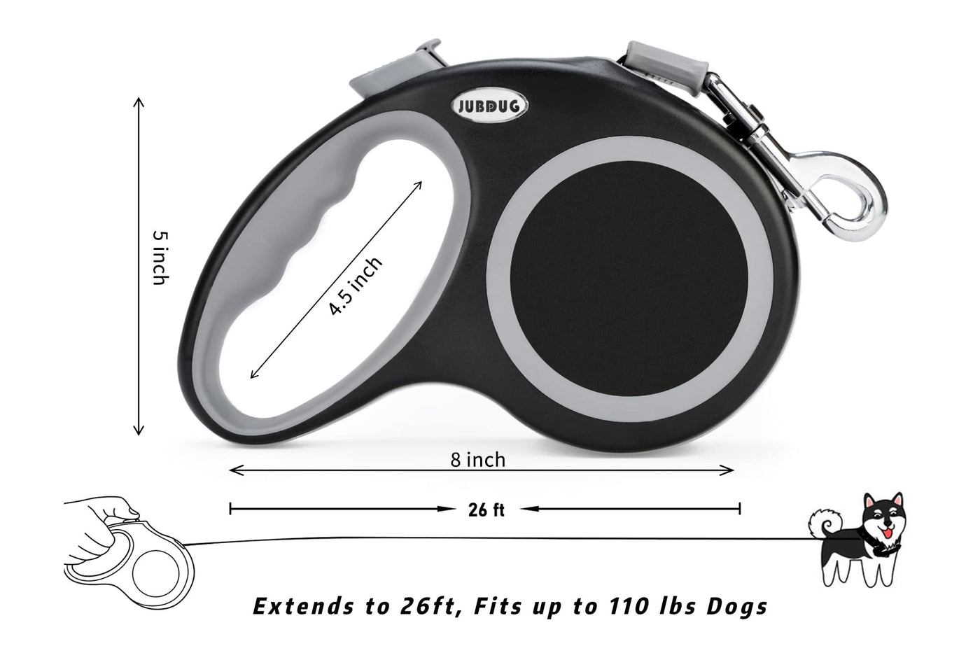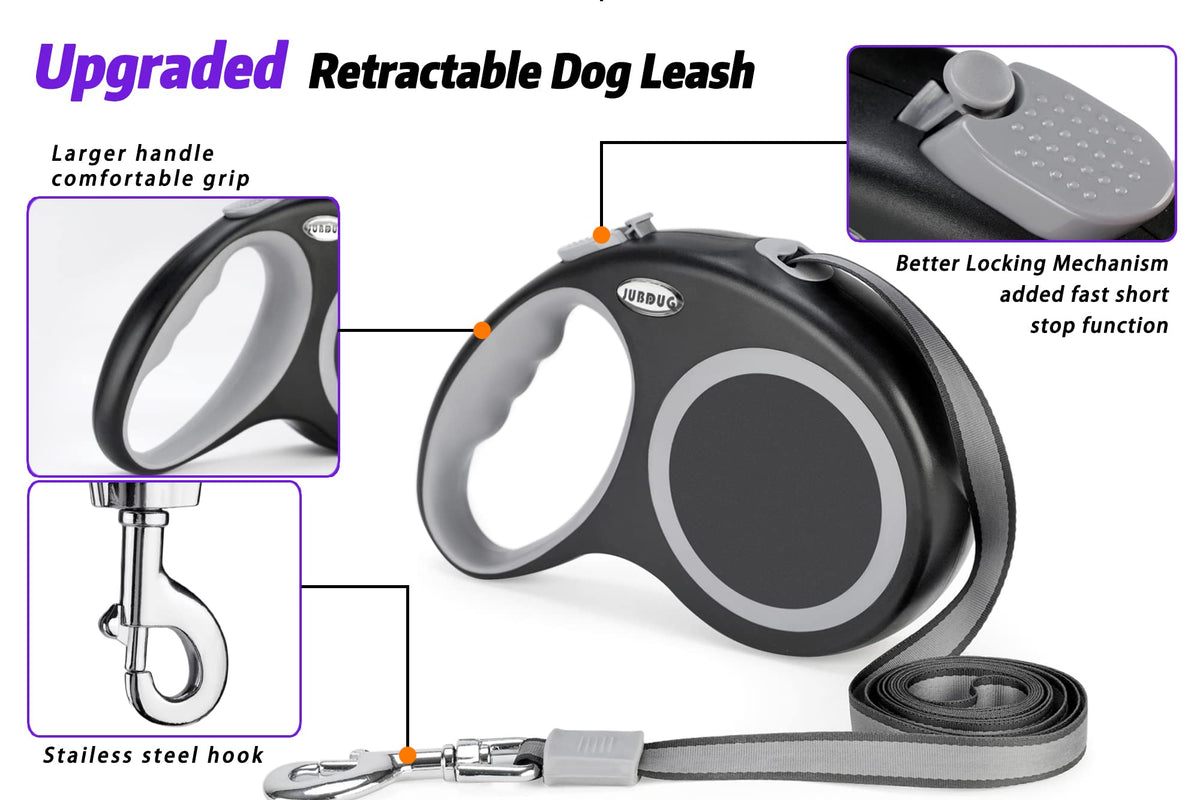 Jubdug Retractable Leash Adapts Corrosion Resistant Abs+Tpe Plastic And Strong Nylon Tape , Ergonomic Handle Grip Design Fit Hands Better When Handing It. Flexible And Smooth Extending : An Internal Stainless Steel Mechanism Included Makes It Flex Smoothly And Noiselessly, Which Could Prevent It From Stuck, And The Length Of The Tape Can Be Optionally Adjusted As You Like To Control The Acting Range Of The Pets And Prevent Hurting By Tape.